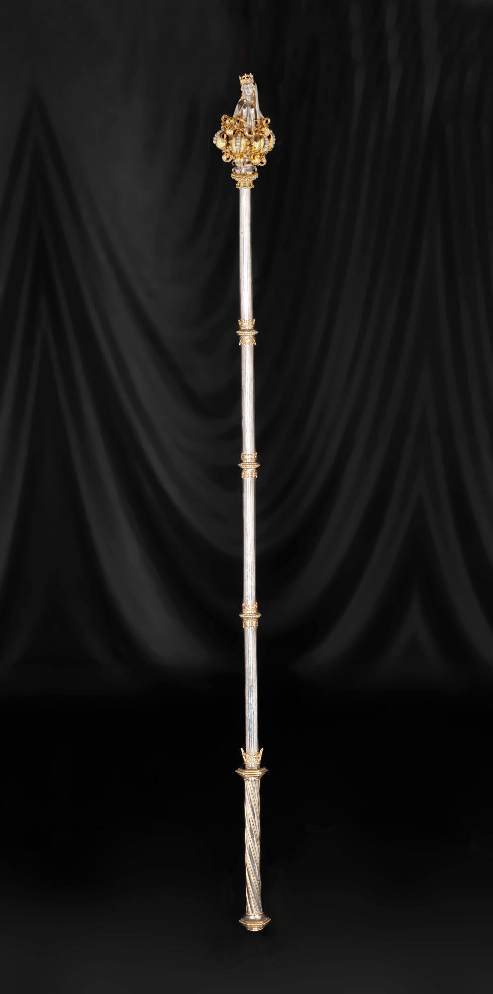 DescriptionDas Zepter ist benannt nach der Hl. Katharina, Schutzpatronin der Artistenfakultät, Vorgängerin der heutigen geisteswissenschaftlichen Fakultäten, wo die Studierenden die sieben ‚artes‘ – so etwa Logik, Rhetorik und Arithmetik – erlernten. Es war ein Auftrag der Artistenfakultät an den Goldschmied Michel zu Wil (Michael Speidel in Weil der Stadt). Es ist teilweise vergoldet, zeigt Reste von ehemaliger grüner Emaillierung und Akanthusranken in à jour Arbeit, teilweise mit Granulation.DimensionsL x B x H (Schaft): 105,5 × 1,6 × 1,6 cm (1055 × 16 × 16 mm)