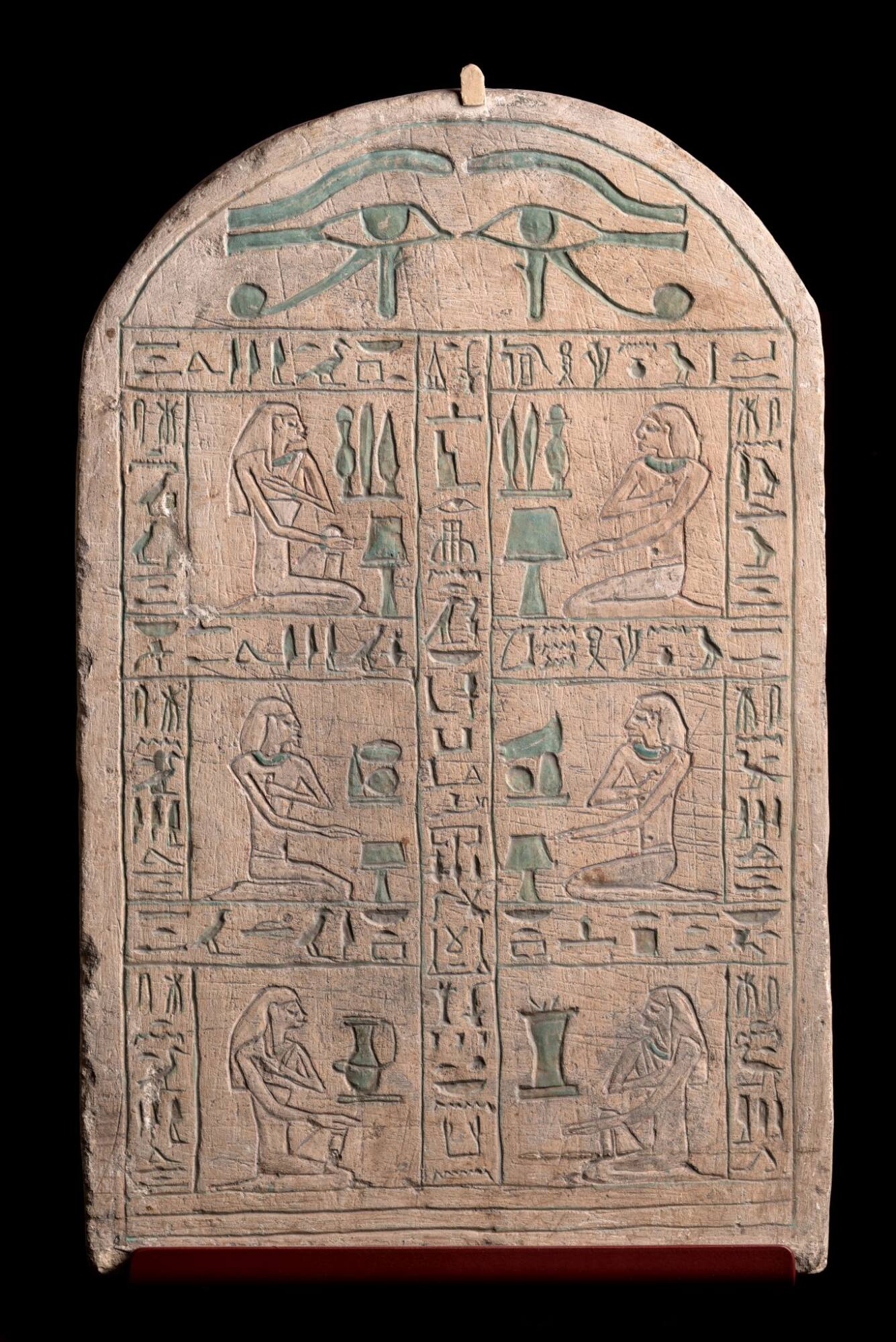 DescriptionAuf dieser Grabstele wird Osiris, der Gott des Jenseits, um ein Opfer gebeten für den verstorbenen Tempelvorsteher Henu (oben rechts), seine Frau Satiji (oben links) und ihre Kinder. Oben sind zwei Horusaugen zum Schutz aufgemalt. Die einst kräftigen Farben sind noch gut zu erkennen.DimensionsL x B x H: 5 × 26 × 41 cm (50 × 260 × 410 mm)