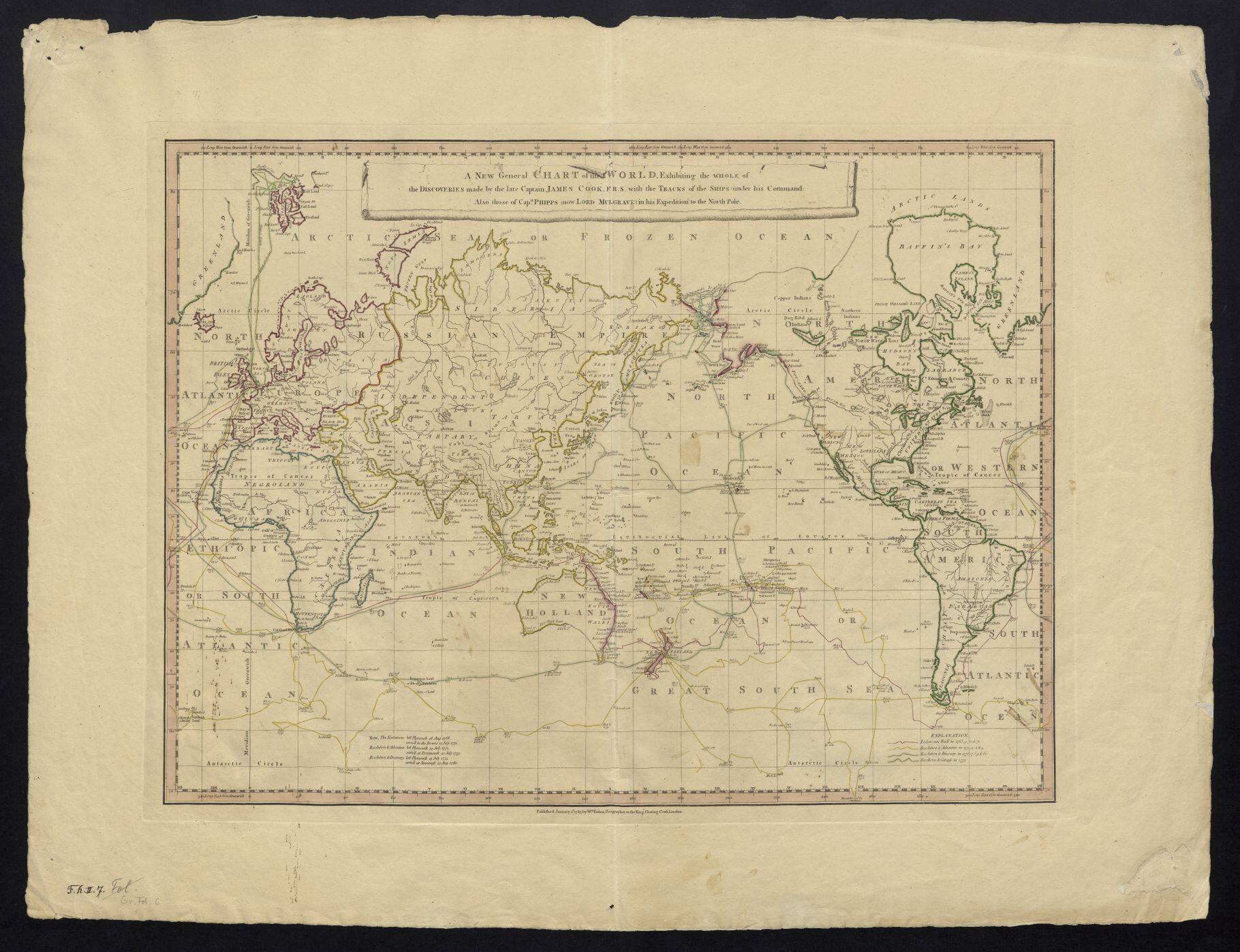 DescriptionAuf der Karte sind die drei Reiserouten von James Cook eingezeichnet und farblich voneinander unterschieden. Die erste Reise ist mit Gelb gekennzeichnet, auf der auch die Küste von Neuseeland kartographiert wurde.DimensionsH x B: 55 × 73 cm (550 × 730 mm)