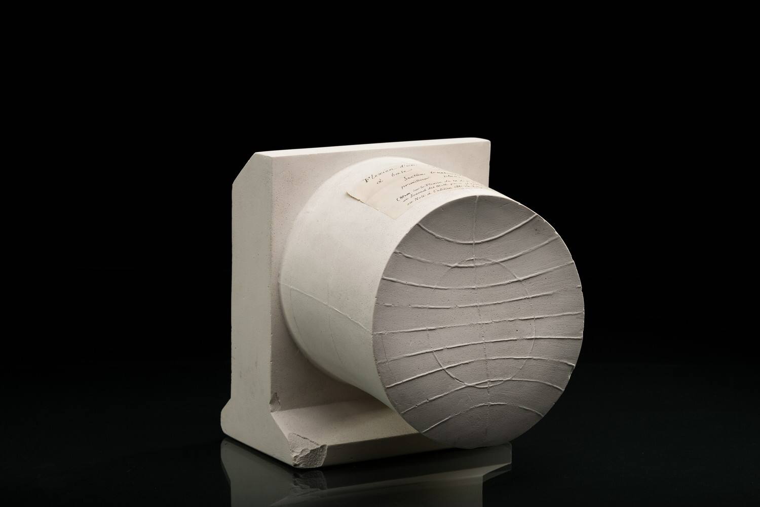 DescriptionGipsmodelle zur Theorie der Torsion und Biegung von Prismen (De Saint-Venant, Mém. Savants Étrangers), Collection Muret von Ch. Delagrave in Paris. Nr. 328–338.Biegung eines Zylinders mit Kreisbasis, Preis 6 ffrs.