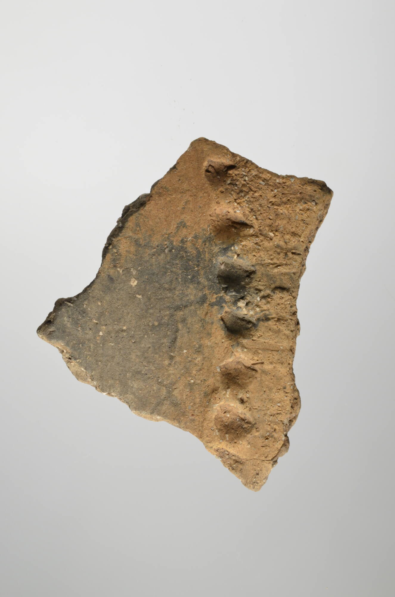 DescriptionDer Kirchberg bei Reusten ist, gemessen an seiner zeitlichen Fundverteilung, eine Höhensiedlung vor allem der Früh- und Mittelbronzezeit, da die meisten Funde aus der Übergangsphase Bz A2/B1 stammen. Diese Wandscherbe zählt zu der, gegenüber der Feinkeramik, gröberen und tendenziell helleren Wirtschaftsware. Sie stammt von einem großen, braunschwarzen Gefäß, welches mit lokal verfügbarem Kalkstein gemagert und innen roh geglättet wurde. Außen hat es die typische Oberflächenbehandlung der Kirchberger Wirtschaftsware erfahren. Eine horizontal aufgesetzte Leiste, die mit Findertupfen verziert ist, trennt den Gefäßkörper in zwei Zonen: eine geglättete oberhalb und eine mit Schlicker aufgeraute unterhalb der Zierleiste. Die Schlickerrauhung ist wahrscheinlich ein neolithisches Erbe und dient nicht nur der Verzierung, sondern hat auch praktische Gründe. Zum einen lässt sich das Gefäß dadurch besser handhaben, zum anderen wird dadurch die Oberfläche vergrößert, wodurch der Inhalt schneller erhitzt werden kann.DimensionsLänge: 8,4 cm