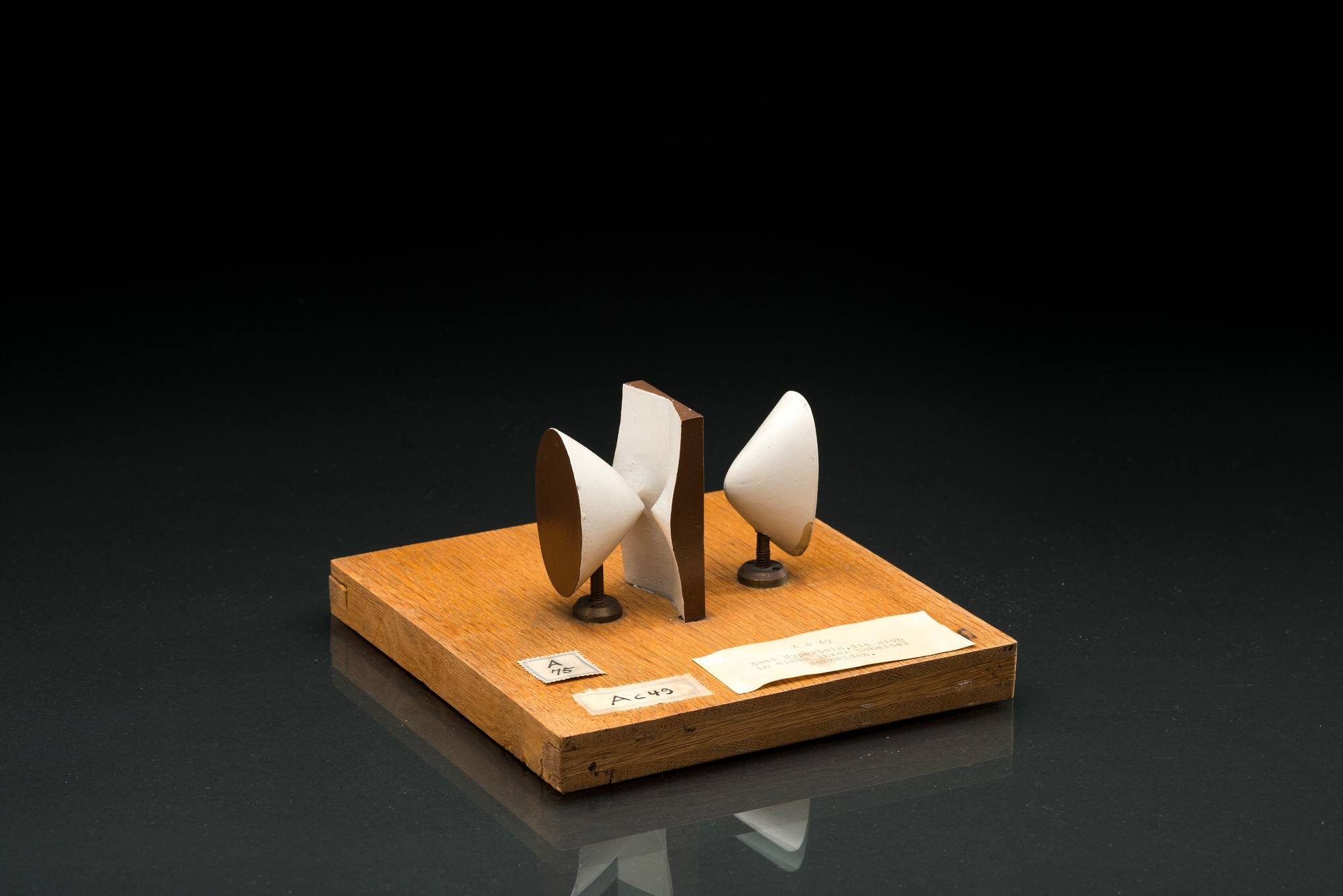 Description27 mathematische Oberflächen nach Plücker, in Zinkguß: Äquatorialkomplexflächen (vgl. dessen Neue Geometrie des Raumes): Ein beweglicher Kugelschnitt, [...] dessen beide Scheitel haben in 2 zueinander und auf der Ebene der bewegl. Kugelschnitts senkrecht stehenden Ebenen folgende Seitkurve. Von W. Lesemeister in Köln. Preis zus. 450.– M.(Inventar des Mathematischen Seminars der Universität Tübingen, 1933, S. 18–19.)