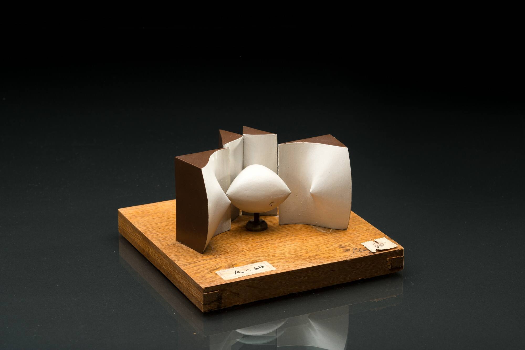 Description27 mathematische Oberflächen nach Plücker, in Zinkguß: Äquatorialkomplexflächen (vgl. dessen Neue Geometrie des Raumes): Ein beweglicher Kugelschnitt, [...] dessen beide Scheitel haben in 2 zueinander und auf der Ebene der bewegl. Kugelschnitts senkrecht stehenden Ebenen folgende Seitkurve. Von W. Lesemeister in Köln. Preis zus. 450.– M.(Inventar des Mathematischen Seminars der Universität Tübingen, 1933, S. 18–19.)