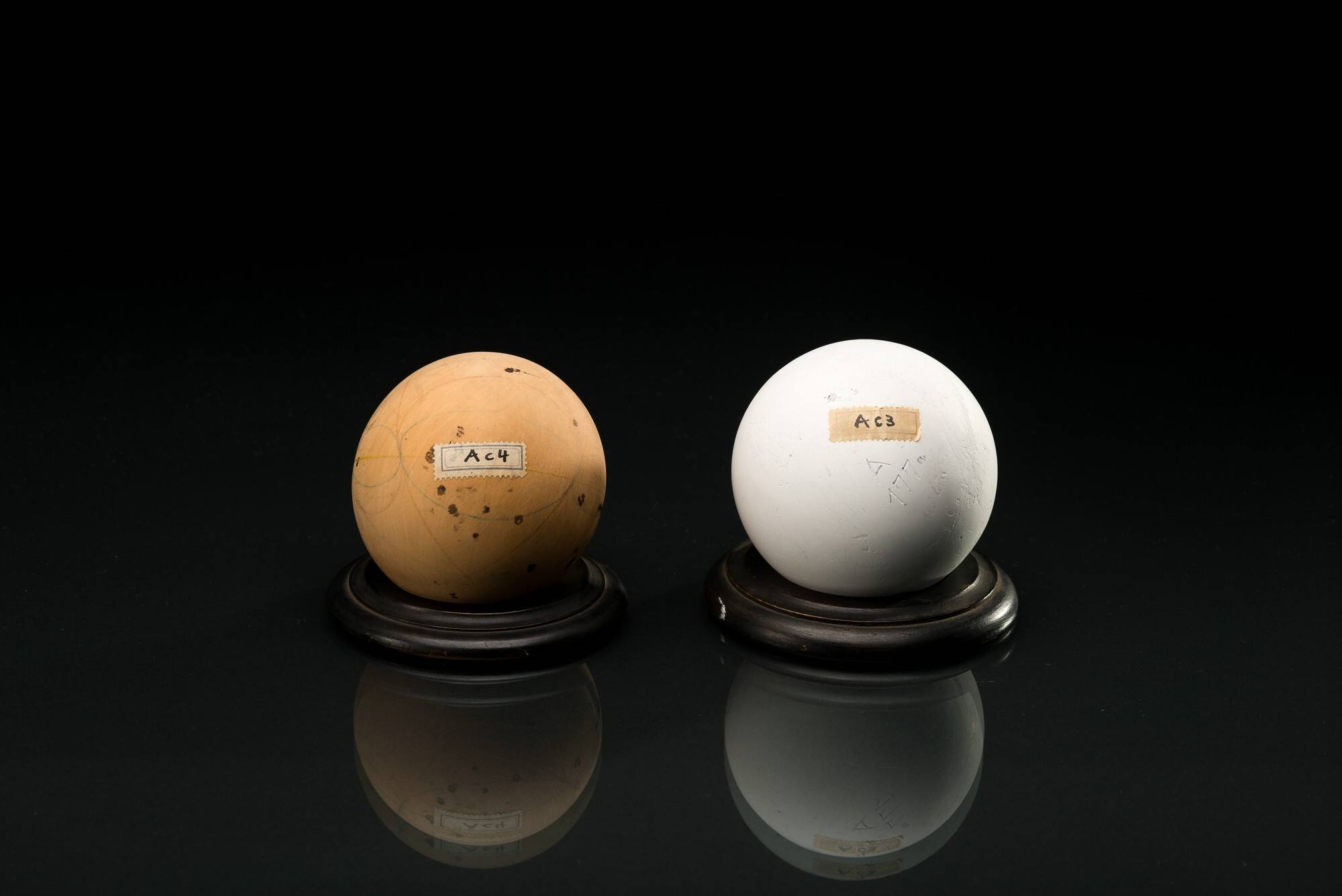 DescriptionJe eine Kugel aus Gips bzw. Holz zur Aufzeichnung von Durchschnittskurven mit Kegeln 3. Ordnung (Kölmel) , Kreittmayr, Preis 1,50 M.(Inventar des Mathematischen Seminars der Universität Tübingen, 1933, S. 16–17.)
