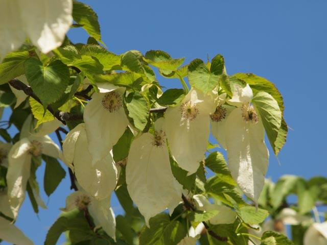 DescriptionDer Taschentuchbaum ist zur Blütezeit durch seine schneeweißen Hochblätter besonders auffällig. Diese Hochblätter erscheinen bereits mit dem Austrieb, bleiben aber lange grün und laubblattähnlich. Erst zur Blüte strecken sie sich und verlieren nach und nach das Blattgrün bis sie vollkommen weiß sind. Die eigentlichen Einzelblüten sitzen in kugelförmigen Blütenständen zusammen, wobei nur eine einzige Blüte zwittrig und alle anderen Blüten männlich sind.Blütezeit: Mai