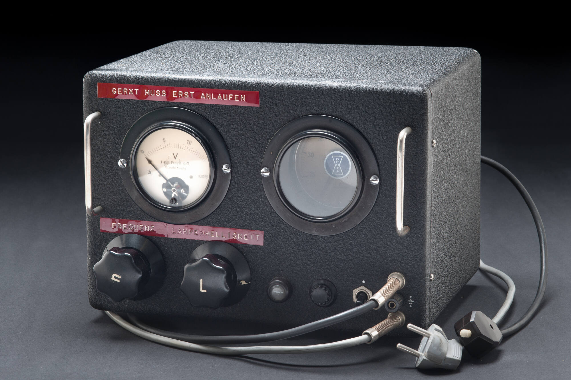 DescriptionFür diesen Versuch sind zwei Personen nötig. Eine der beiden Personen stellt die Helligkeit und Geschwindigkeit der, sich im inneren des Gerätes befindenden, rotierenden Scheibe ein. Anschließend blickt der zweite Beteiligte – die tatsächliche Versuchsperson – in das Sichtfeld und beschreibt, bei welcher Einstellung er kein Flimmern mehr beobachten kann. Die Flimmerverschmelzung ist in der Neurophysiologie eine Erscheinung, bei der in kurzen Zeitintervallen aufeinanderfolgende Helligkeitsschwankungen phänomenal in einem konstanten Helligkeitseindruck verschmelzen.