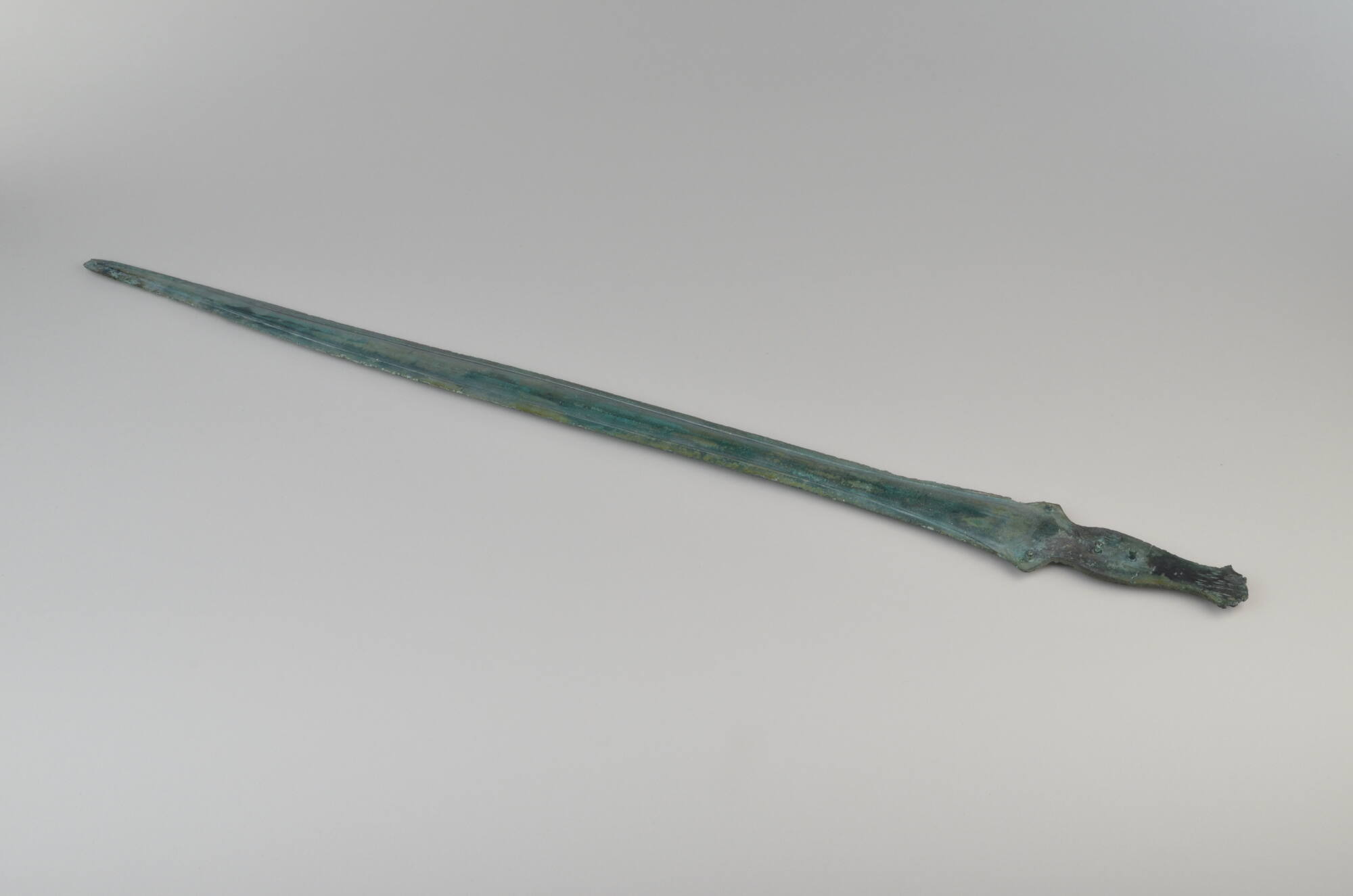DescriptionAuf der recht spät landwirtschaftlich intensiv genutzten Schwäbischen Alb waren noch bis ins 19. und 20. Jahrhundert etliche Grabhügel sichtbar und wurden, aufgrund des wachsenden Interesses an den Altertümern der eigenen Vorgeschichte, ausgegraben. Dieses bronzene Schwert der älteren Hallstattzeit stammt aus einem Grab, welches 1904 bei Straßenarbeiten in der Nähe der Maria Buch Kapelle angeschnitten wurde. Das Grab enthielt neben dem Schwert viel Kohle, reich verzierte Tonscherben und Armringe. Von den Funden wurde nur das Schwert aufgehoben und der Universität Tübingen übergeben. Der Griff besteht aus einer zungenförmigen Verlängerung der Klinge, auf deren Ober- und Unterseite jeweils aus organischen Materialien gefertigte Griffschalen, welche nicht erhalten sind, befestigt waren. Am obersten Teil der Klinge befindet sich ein nicht geschliffener Bereich. Dieser wird als Fehlschärfe oder Ricasso bezeichnet. Anders als lange angenommen, wurden die Schwerter nicht nur als Abzeichen, sondern auch tatsächlich als Waffe genutzt, was sich an den kleinen Beschädigungen an der Schneide zeigt, bei denen das Metall zu kleinen Wülsten zusammengeschoben wurde und über die sich eine einheitliche Patina bildete.DimensionsLänge: 75,6 cm