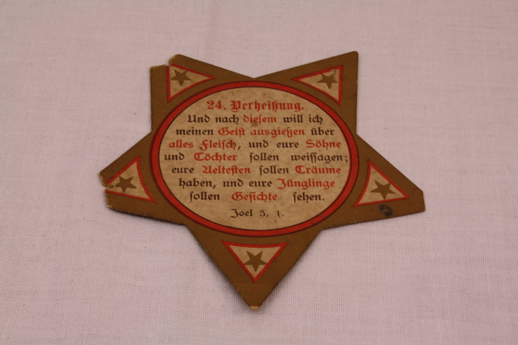 Descriptionpietistischer Weihnachtsbaumschmuck: 7 gleiche, gold-rote Sterne mit verschiedenen Bibelsprüchen bedruckt, Rückseiten goldfarben