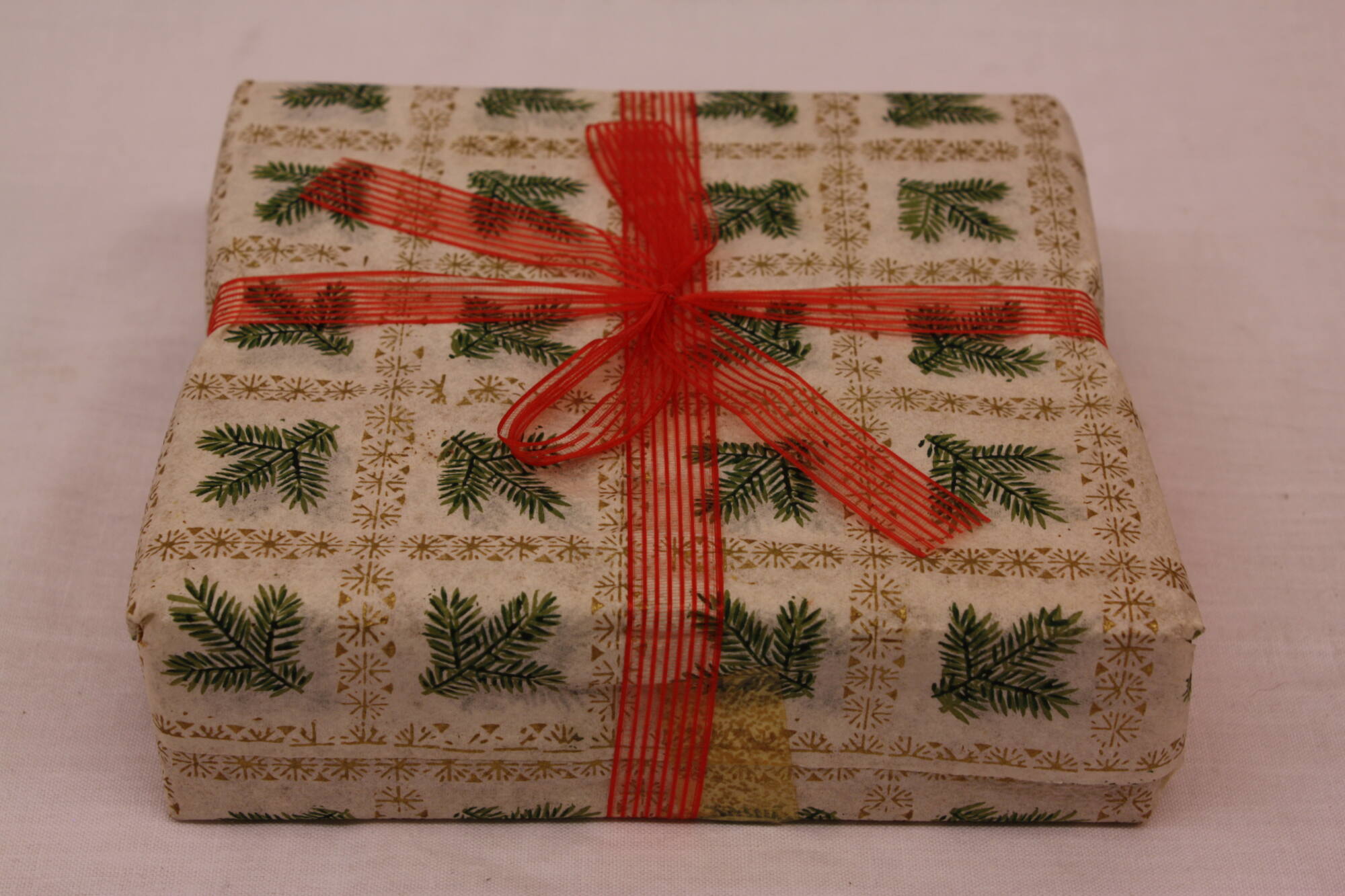 DescriptionImitation für Ausstellung, hergestellt 1974 Leere Schachtel, mit Weihnachtspapier (grüne Tannenzweige, Goldsternstreifen) und roten Seidenbändern verschnürt.
