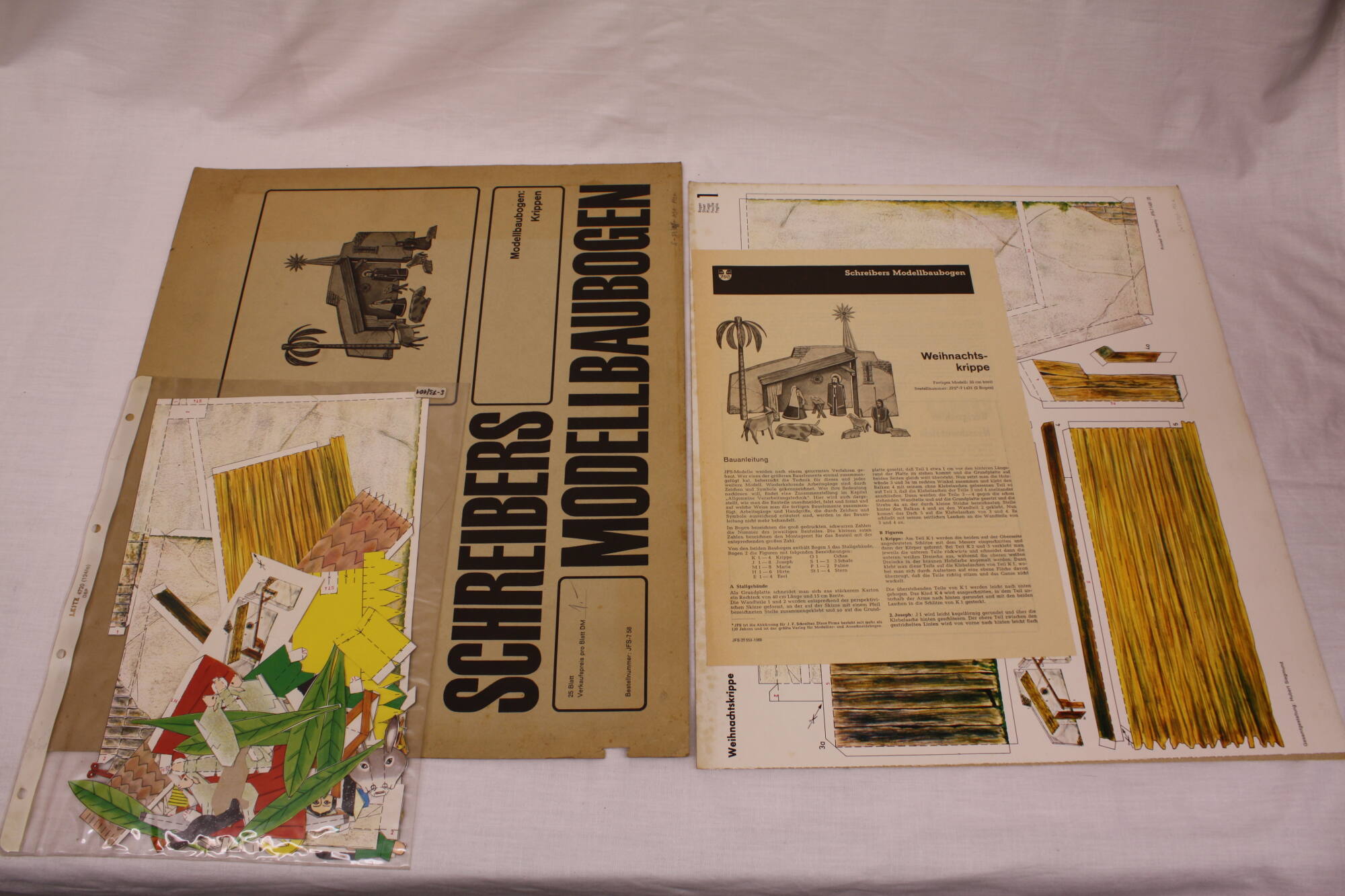 DescriptionAusschneidekrippe zum Falten und Zusammenkleben für 3-dimensionale Gestaltung, 46 Teile, mit Bauanleitung. Modernistische Stil. Gesamtgestaltung: Hubert Siegmund. Verlag: J.F. Schreiber, Esslingen