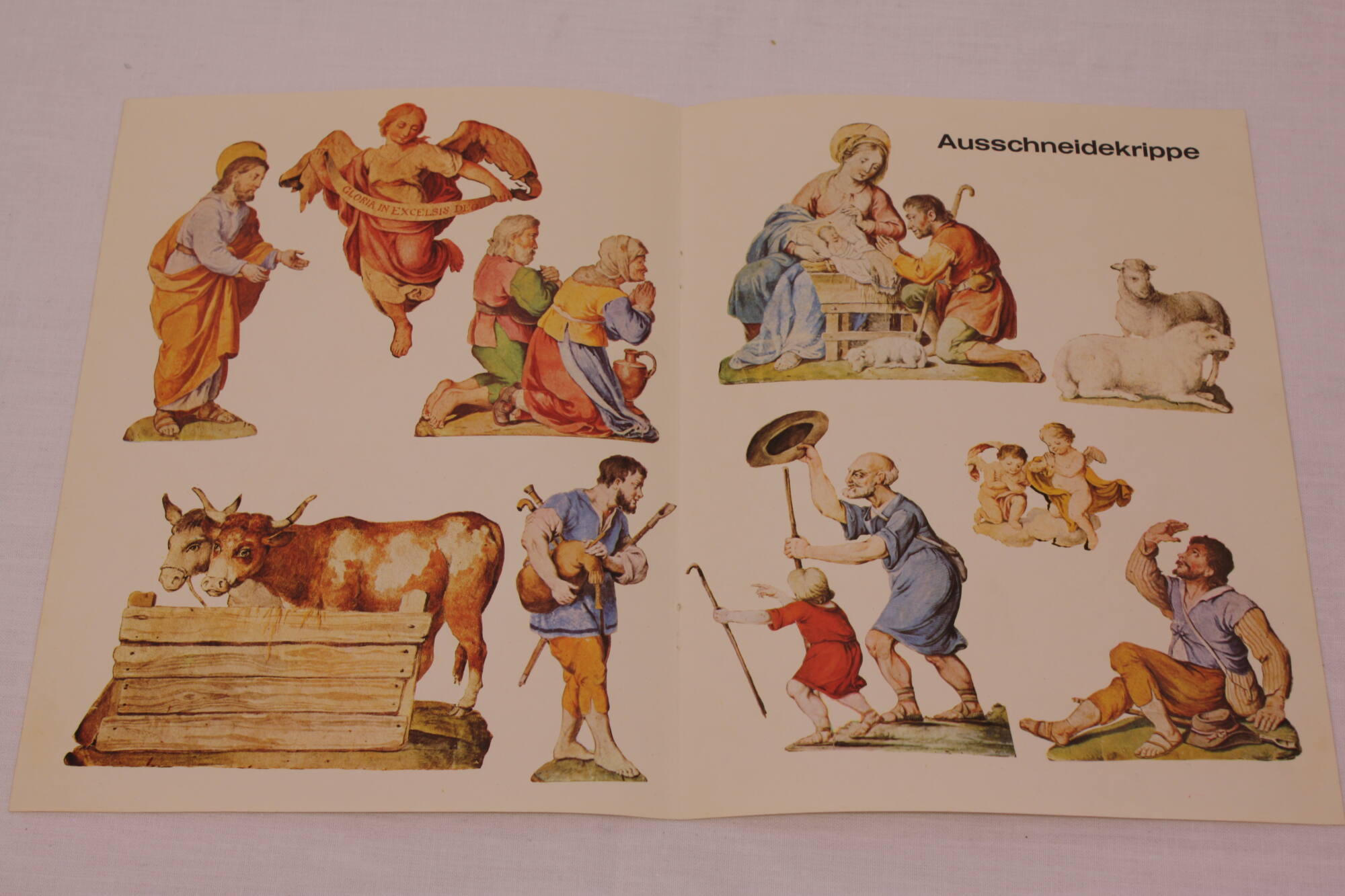 DescriptionAusschneidekrippe, 24 Teile. Etwas grober Stil. Auf dem Karton UHU-Reklame. Verlag: PV