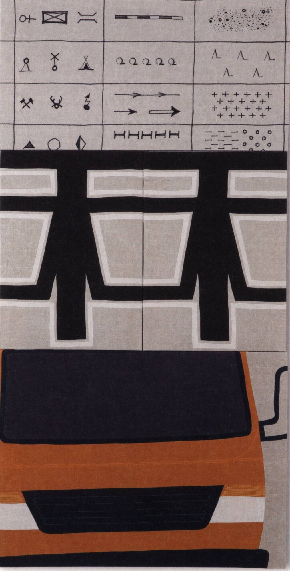 DescriptionEine Leinwandcollage aus vier Teilen. Oben wurden Signaturen für Landschaftselemente abgebildet. In der Mitte ist ein schwarzes Fachwerk Tübingens zu sehen und unten die Frontalansicht eines Transporters.Mitarbeit: Katti Galsterer