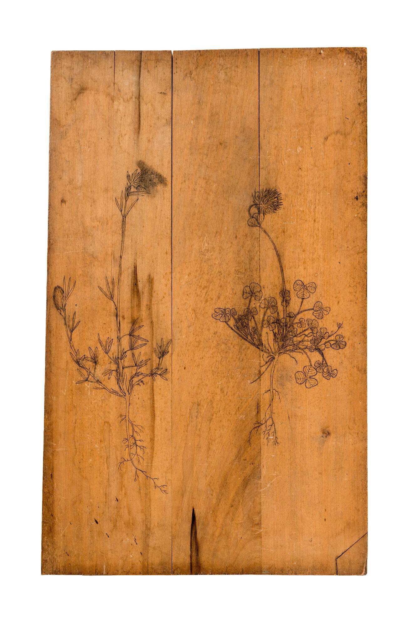 Druckplatte mit den Abbildungen eines Schmalblättrigen Klees (Trifolium angustifolium) links und eines Sternklees (Trifolium stellatum) rechts. Beide gehören zur Gattunge Trifolium in der Familie der Fabaceae.