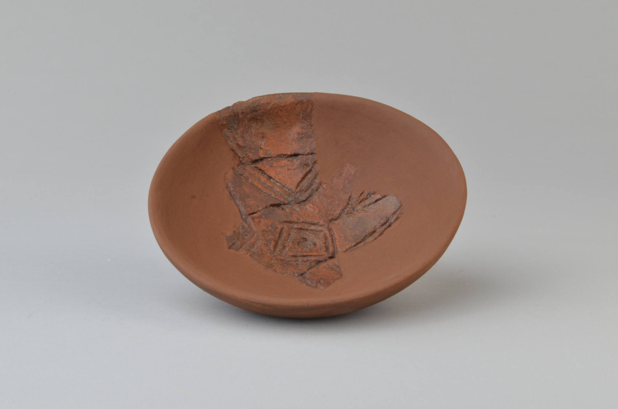 DescriptionEine kleine Schale aus rotem Ton im Alb-Hegau-Stil, auch Alb-Salem-Stil genannt. Diese Keramik ist eine Eigenheit der südwestdeutschen Hallstattkultur in der älteren Hallstattzeit. Im Vergleich mit der Siedlungskeramik, insbesondere der bemalten Keramik der Heuneburg, ist sie handwerklich schlecht ausgeführt, oft nur grob gemagert und bei niedrigen Temperaturen gebrannt. Deshalb und weil die übergroßen Schalen im alltäglichen Gebrauch sehr bruchgefährdet gewesen wären, dürften diese für die Bestattung als spezielle Grabkeramik hergestellt worden sein.DimensionsHöhe: 3 cm