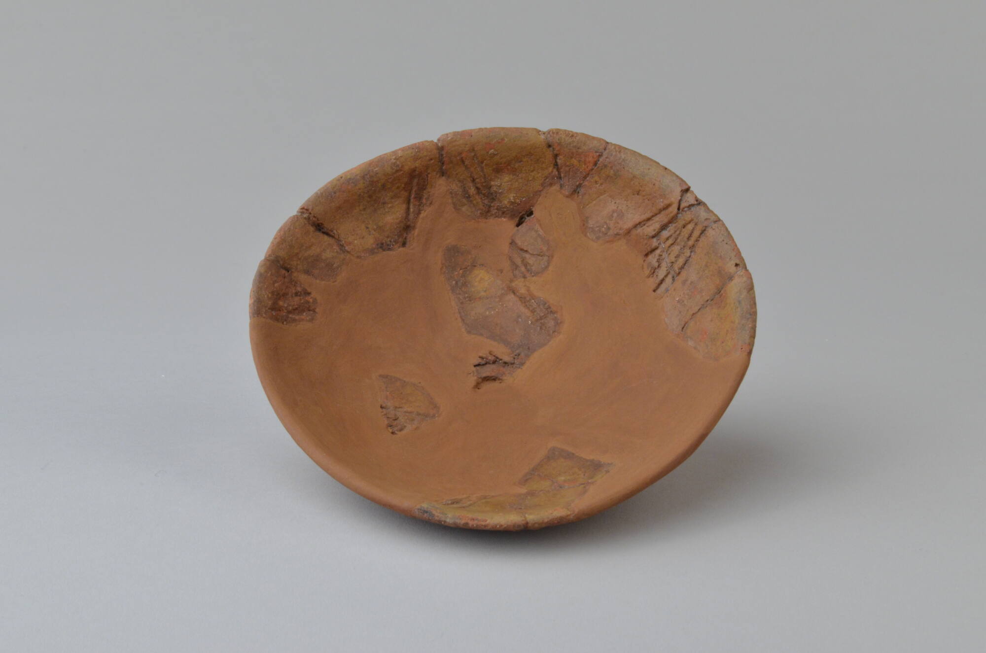 DescriptionIn den 1920er und 30er Jahren wurden bei der Bebauung des damaligen nordwestlichen Stadtrandes von Tübingen, in der Flur Geigerle, der heutigen Hallstattstraße, sieben, bereits stark gestörte Grabhügel vom Urgeschichtlichen Forschungsinstitut der Universität Tübingen registriert. Aus Hügel 2 stammen die Reste einer großen, flachen, ritzverzierten Schale des Alb-Salem-Stils. Diese Keramik ist eine Eigenheit der südwestdeutschen Hallstattkultur. Im Vergleich mit der Siedlungskeramik, insbesondere der bemalten Keramik der Heuneburg ist sie handwerklich schlecht ausgeführt, oft nur grob gemagert und bei niedrigen Temperaturen gebrannt. Deshalb und weil die übergroßen Schalen im alltäglichen Gebrauch sehr bruchgefährdet gewesen wären dürfte die Alb-Salem-Keramik extra für die Bestattung als spezielle Grabkeramik hergestellt worden sein.DimensionsDurchmesser (Rand): 13,5 cm