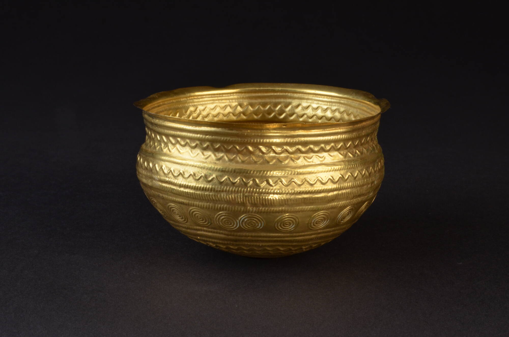 Ähnlich wie bei der Goldschale, die unter UFG-Os-3915 zu sehen ist, fällt bei diesem Objekt der einfache Gürtel aus Punktkreisprägungen knapp unter der Gefäßschulter ins Auge, jedoch sind am Hals, sowie am Kugelboden nicht einfache, sondern doppelte Wellenlinien ins Material geprägt.