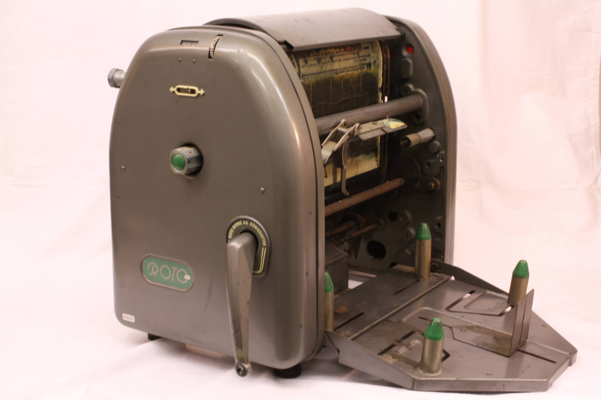 DescriptionRoto 421; Vorläufer der heutigen Kopiergeräte. Der Text für den Vervielfältiger musste mit der Schreibmaschine auf eine Wachsmatritze geschrieben werden. Zur Erstellung der Auszüge musste die Wachsmatritze oder Schablone auf den Verfieltältiger gespannt werden.Dazugehöhrend Packung Umdruckpapier (Pelikan)