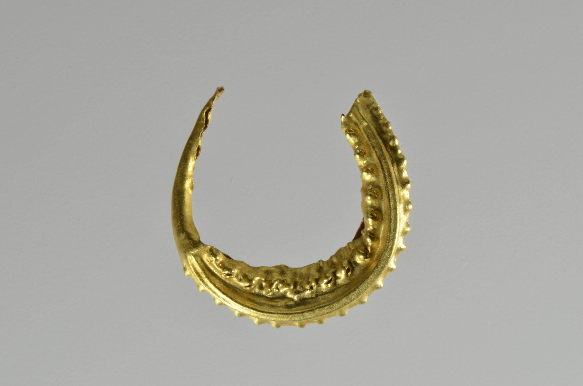 DescriptionEin goldener Segelohrring, verziert mit drei Reihen Perlen, die durch erhobene Rippen getrennt sind. Der Goldohrring wurde gemeinsam mit sieben gleich gestalteten Ohrringen (UFG-Os-3939 – UFG-Os-3945), zwei Bronzeringen (UFG-Os-3947, UFG-Os-3964) und weiteren, inzwischen verschollenen Gegenständen in Grabhügel vier des Gräberfeldes bei Rommelsbach gefunden.DimensionsGewicht: 0,49 g
