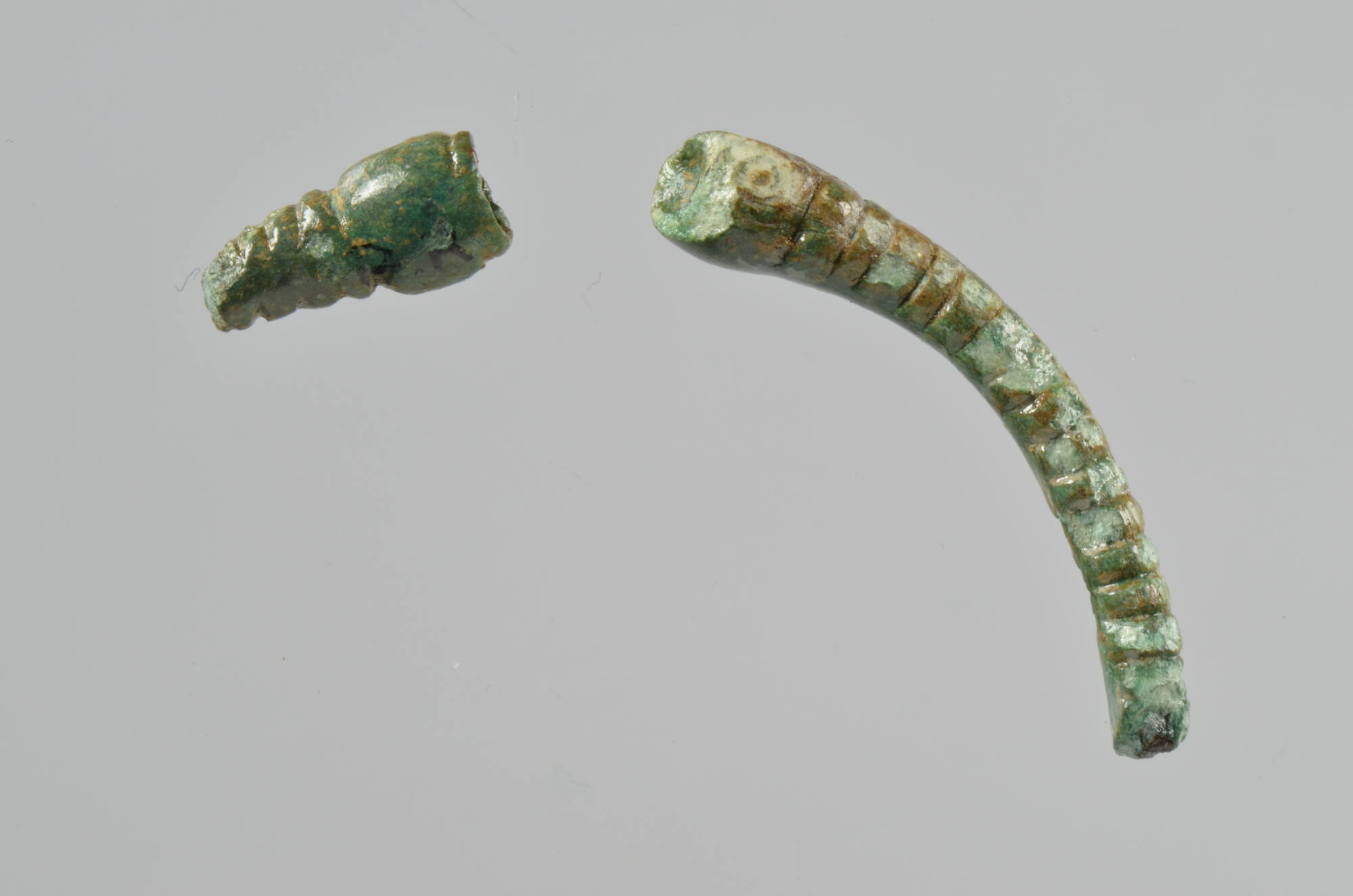 DescriptionZwei Enden in Keulenform eines offenen, bronzenen Armrings, die punktkreisverziert und näpfchenförmig ausgehöhlt sind. Der Armring ist mit Kerben dekoriert. Die Armringfragmente können keinem bestimmten Grabhügel aus Rommelsbach mehr zugeordnet werden.