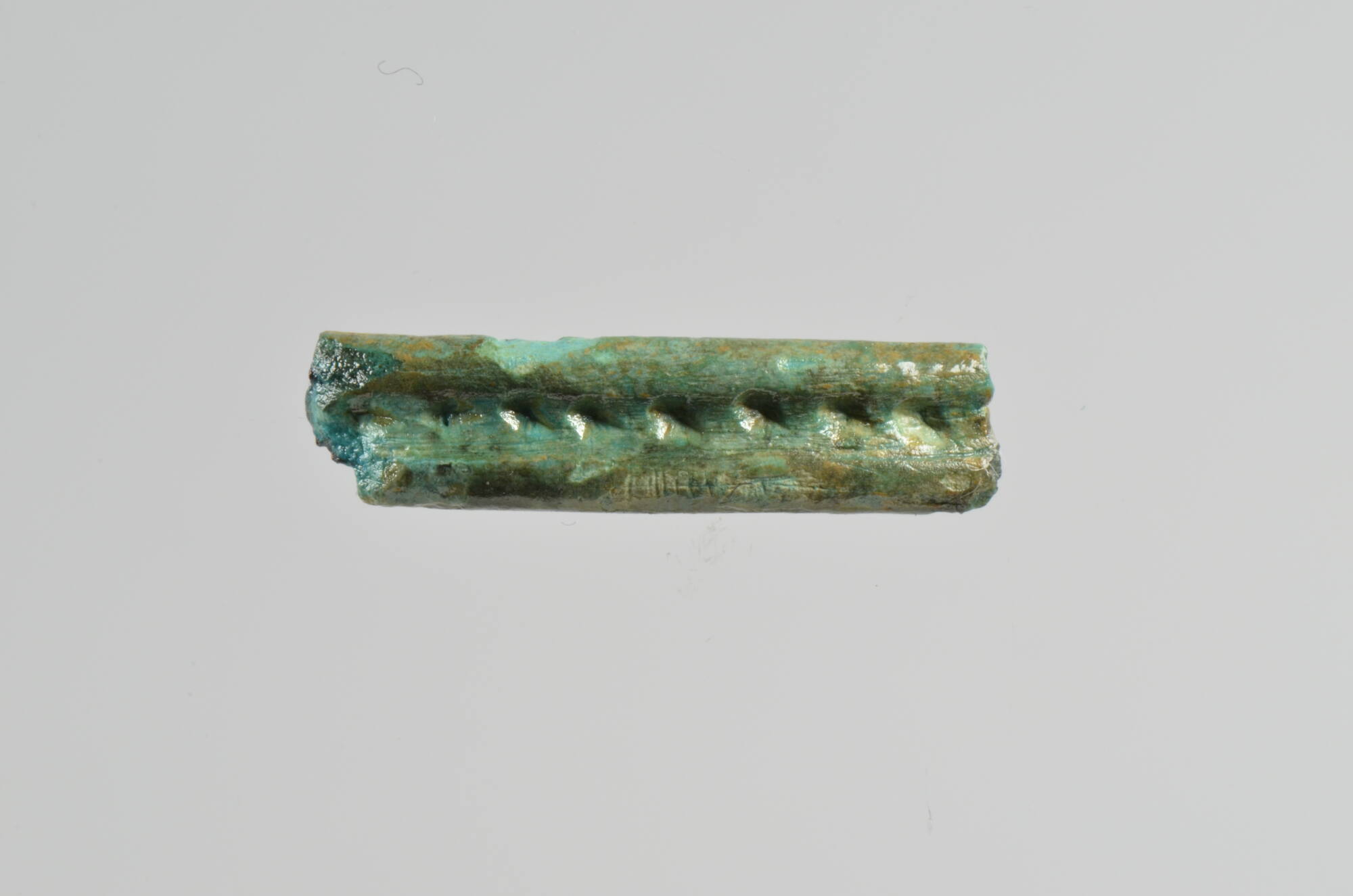 DescriptionBei diesem Objekt handelt es sich um das Bruchstück eines bronzenen Rings. Die Ränder der Außenseite sind erhöht, die dadurch entstehende Vertiefung ist mit punzierten Eindrücken in Pyramidenform verziert. Das Fragment des Bronzerings kann keinem bestimmten Grabhügel des Gräberfeldes bei Rommelsbach mehr zugeordnet werden.Object numberUFG-Os-3963