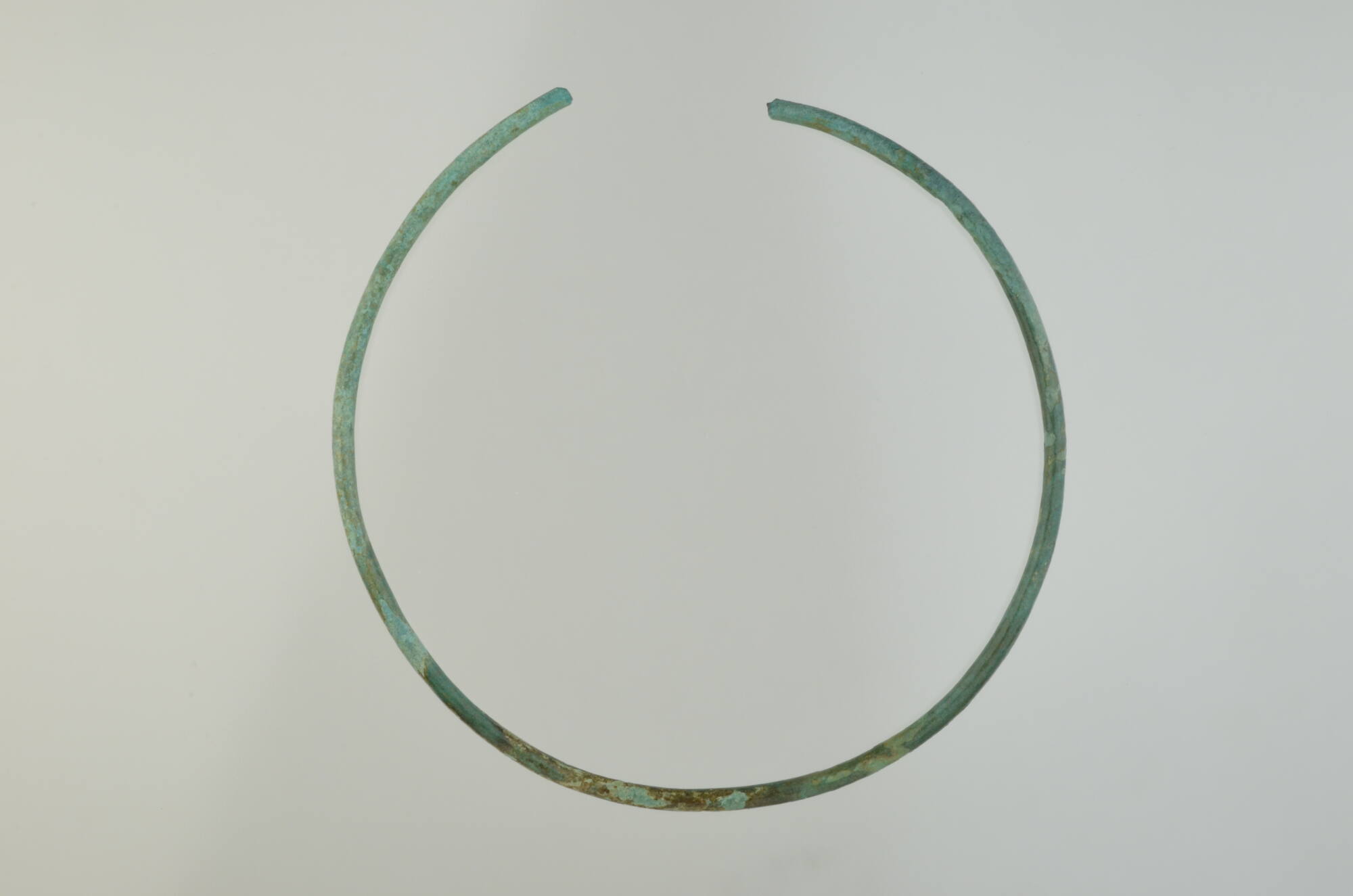 DescriptionDer rundstabige, unverzierte Bronzering wurde gemeinsam mit einem größeren Bronzering (UFG-Os-3947), acht gleich gestalteten Ohrringen (UFG-Os-3939 - UFG-Os-3946) und weiteren, inzwischen verschollenen Gegenständen im Grabhügel 4 von Rommelsbach gefunden.DimensionsDurchmesser: 17,2 cm