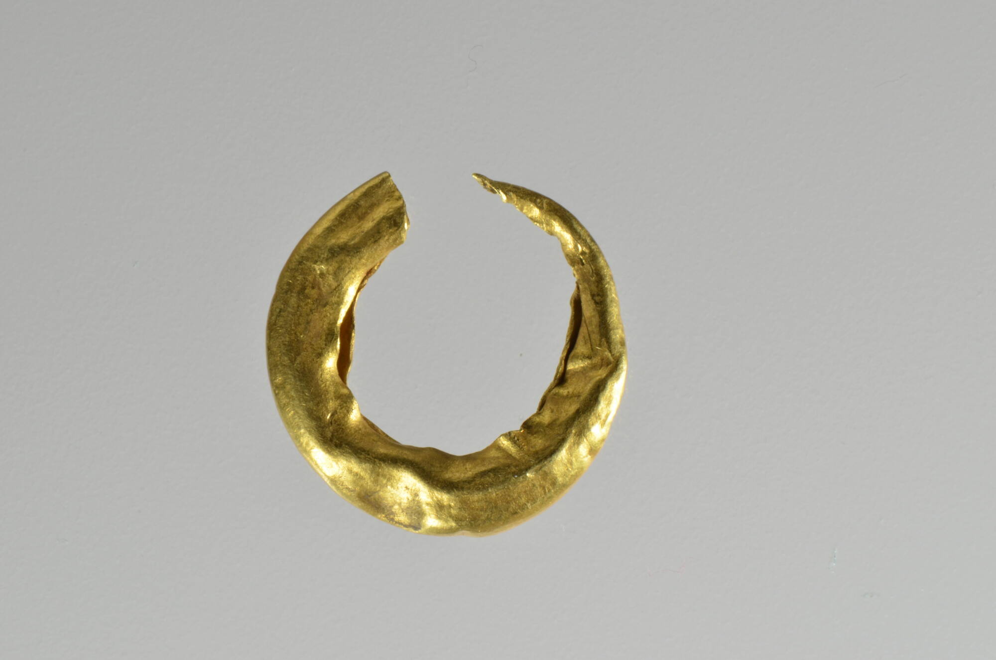 DescriptionDieser unverzierte, hohle Ohrring besteht aus Goldblech. Er wurde gemeinsam mit zwei weiteren Goldohrringen (UFG-Os-3967 & UFG-Os-3969) in einem Grabhügel im "Spitalwald" bei Stuttgart-Degerloch gefunden.DimensionsDurchmesser: 1,4 cm