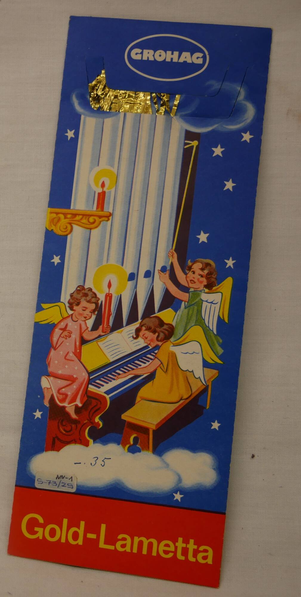 DescriptionWeihnachtsbaumschmuck, Gold-Lametta in buntbedruckten PapierumschlägenMediumPapier