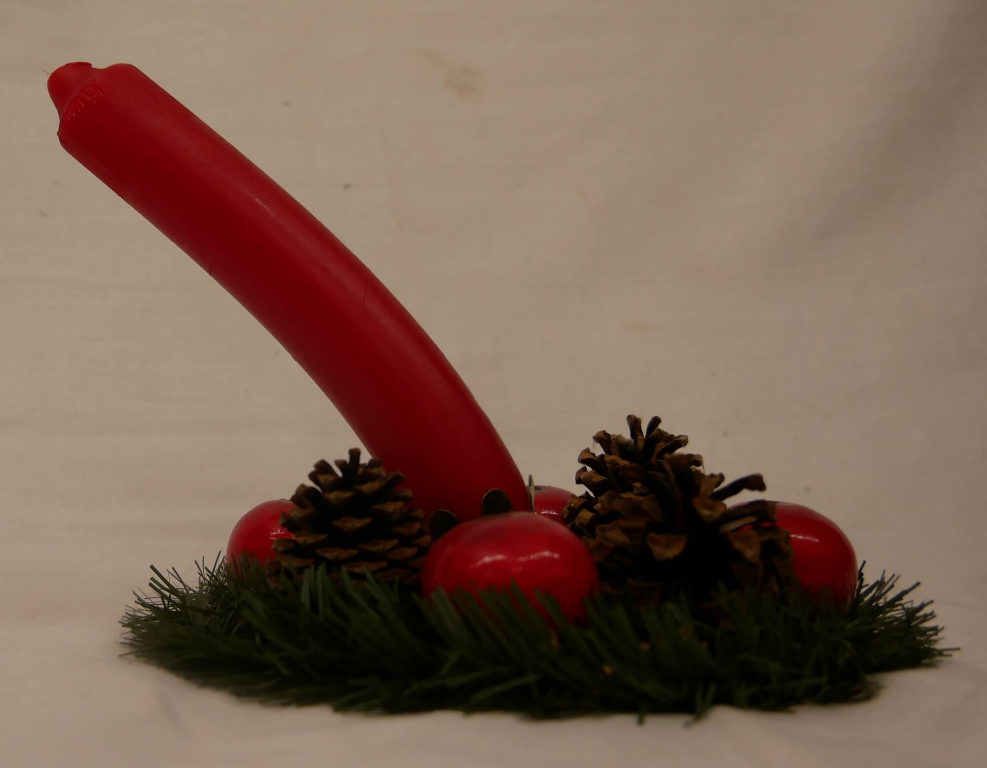 Descriptionrote Stearinkerze, goldener Blechkerzenhalter, 4 rote Kunststoffäpfel, 4 Kiefernzäpfchen, Kunststofftannenzweige auf rundem Karton montiert.Kerze verbogen