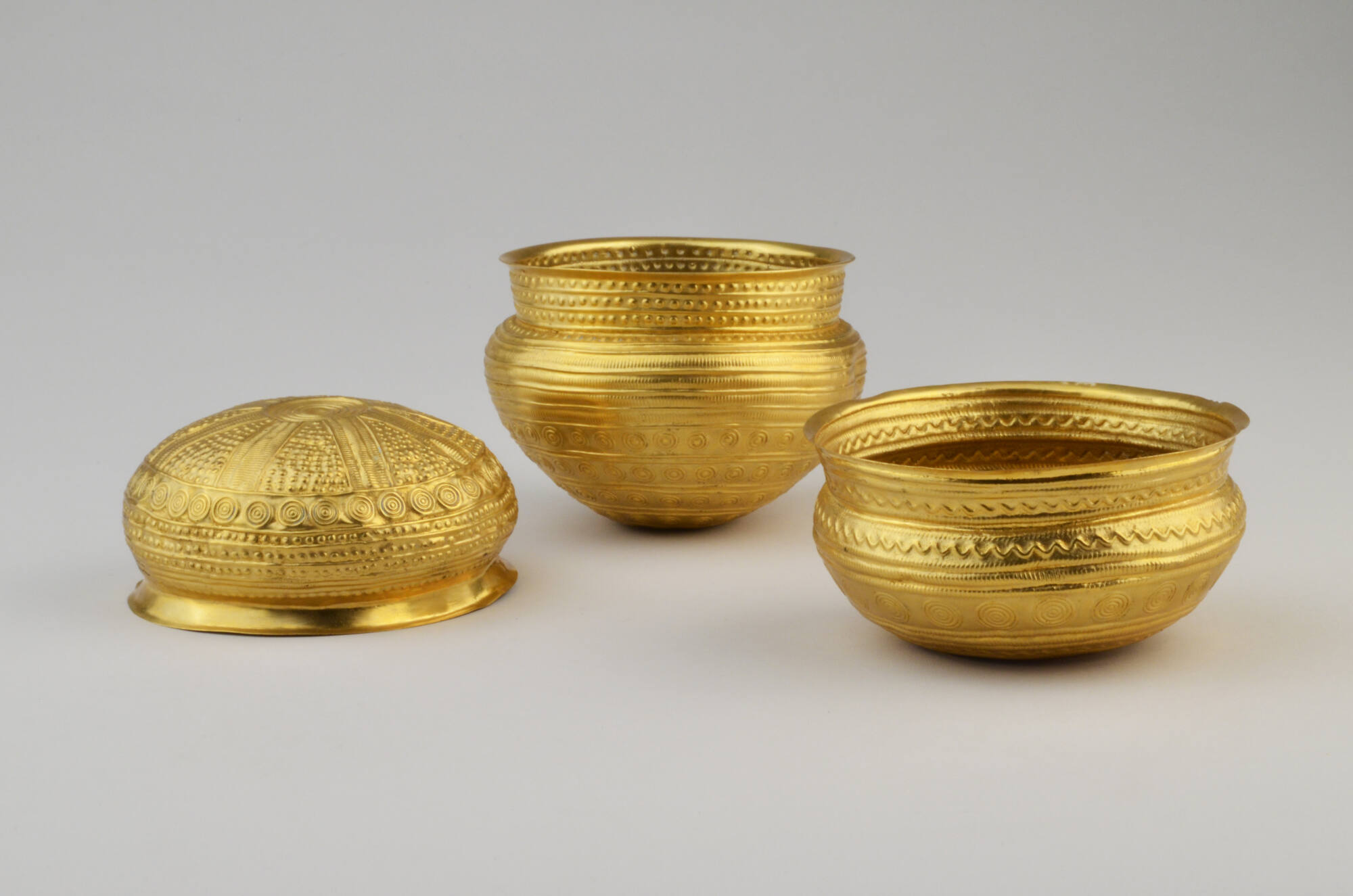 DescriptionDie acht Schalen aus dem Goldschatz von Eberswalde scheinen zunächst mehr oder weniger gleich, jedoch ist jede einzelne individuell gearbeitet. Sie unterscheiden sich vor allem in Größe und Ornamentierung. Die Gefäße beeindrucken durch die ungemein feine Verarbeitung, durch die das Gold in die gewünschte Form getrieben wurde. Trotz der scheinbaren Zartheit der dünnwandigen Behältnisse waren alle acht Goldschalen in sehr gutem Zustand; ein Umstand, der wohl nicht zuletzt dem schützenden Tongefäß zuzuschreiben ist, in dem sie bei ihrer Bergung zu Beginn des 20. Jahrhunderts im Boden lagerten.DimensionsHöhe max.: 7,3 cm