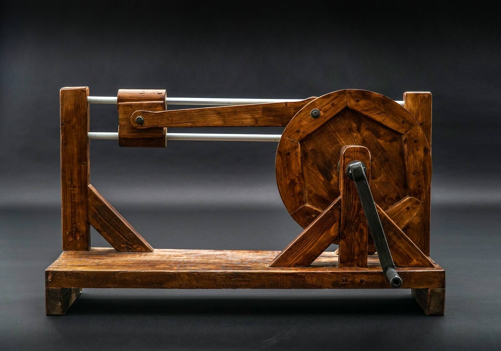 Leonardos Konstruktionsentwurf ist in verschiedenen Schubkurbeleinheiten zu finden, unter anderem in Dampfmaschinen und bis heute in Kolbenmotoren. In diesem Holzmodell wird die Schubkurbeleinheit durch eine Handkurbel angetrieben.