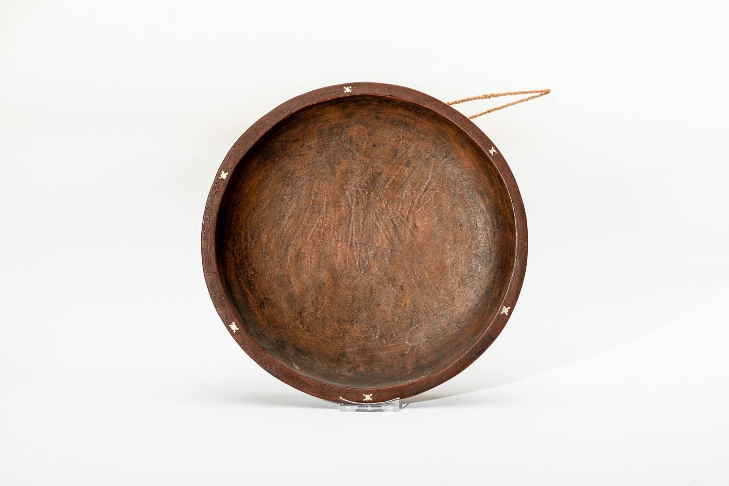 DescriptionDiese runde Speiseschale wird in Palau "madál a gadéng" genannt. Übersetzt bedeutet dies "Auge des Haifisches". Der Rand der Schale ist mit Perlmutteinlagen verziert und wurde vermutlich aus Hibiskusholz hergestellt.DimensionsB x H: 23 × 7 cm