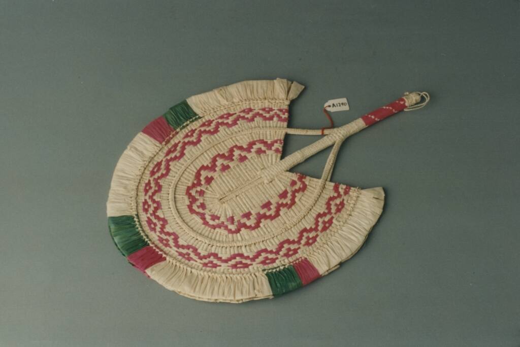 DescriptionDer Fächer wurde als Schmuckfächer verwendet und überwiegend für den Verkauf an Touristen produziert. Im Jahr 1987 waren diese Fächer in Funafuti auch als Wandschmuck in Häusern in Gebrauch, dieim europäischen Stil gebaut wurden. Die zum Einfärben eines des Flechtmaterials verwendeten Chemiefarben sind ein violettstichiges Rot und ein Grün.