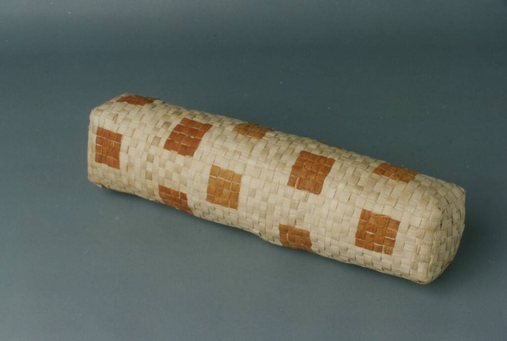 DescriptionDie Nackenstütze in Form einer quadratischen Rolle enthält eine Füllung aus Pananusblattfasern. Diese ist unsichtbar, da sie dicht und überall abschließend mit einer Außenhülle aus etwa 0,7 bis 1,0 cm breiten hellen Pandanusblattstreifen umflochten wurde.DimensionsL x B x H: 40 × 10 × 8 cm
