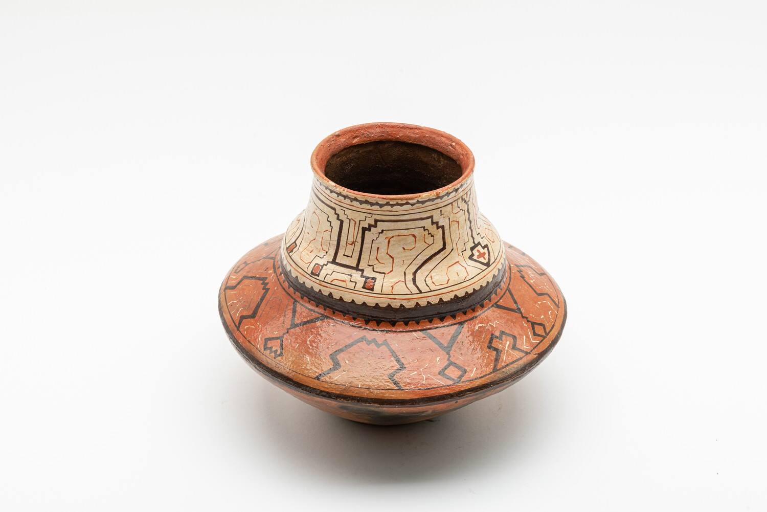 DescriptionDiese Keramik wurde bei den Shipibo-Conibo im Tiefland von Peru hergestellt. Der Wasserkrug "chómo" ist klein und dadurch tragbar und etwas dickwandiger. Oft ist er rot angestrichen und nur am Hals weiß glasiert und bemalt. Aufgrund seiner Porosität und des isolierenden Wassermantels, der sich in seiner Wandung bildet, hat dieses Tongefäß, das nur auf der Außenseite gefirnisst ist, sehr gute Kühlungseigenschaften.DimensionsHöhe: 20,5 cm