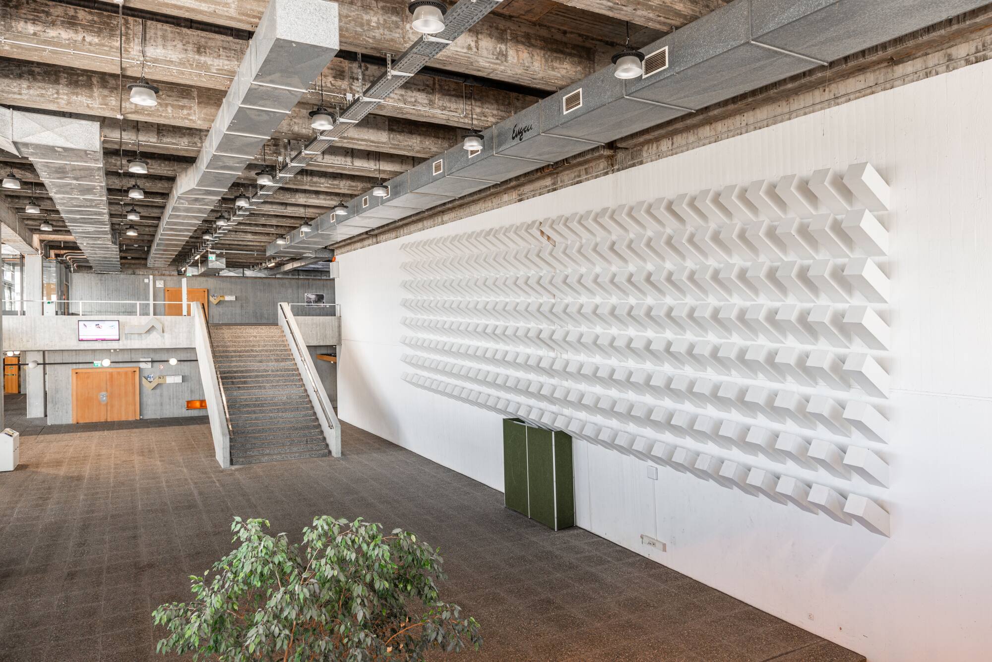 DescriptionWandrelief aus Beton, im Bereich des Haupteinganges, mit vier weiteren Installationen: zwei Feldern am Hörsaaleingang, Außenwand des Hörsaals Standort: Tübingen, Morgenstelle 16, Hörsaalzentrum Foyer, an drei Wänden in vier Teilen