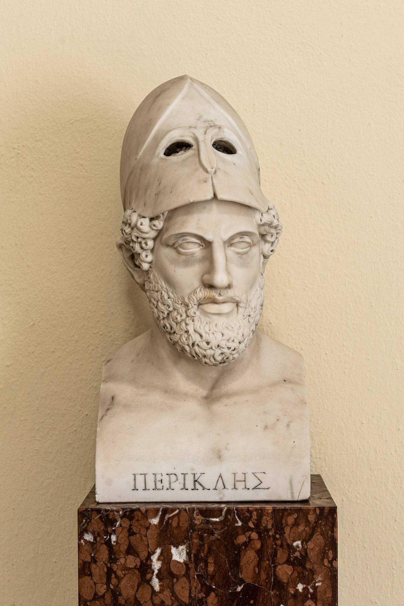 DescriptionBüste des griechischen Feldherren und Politikers Perikles. Er wird dargestellt mit kurzem, lockigen Bart und nach hinten geschobenen korinthischem Helm. Leihgabe aus dem Krongut Ludwigsburg.