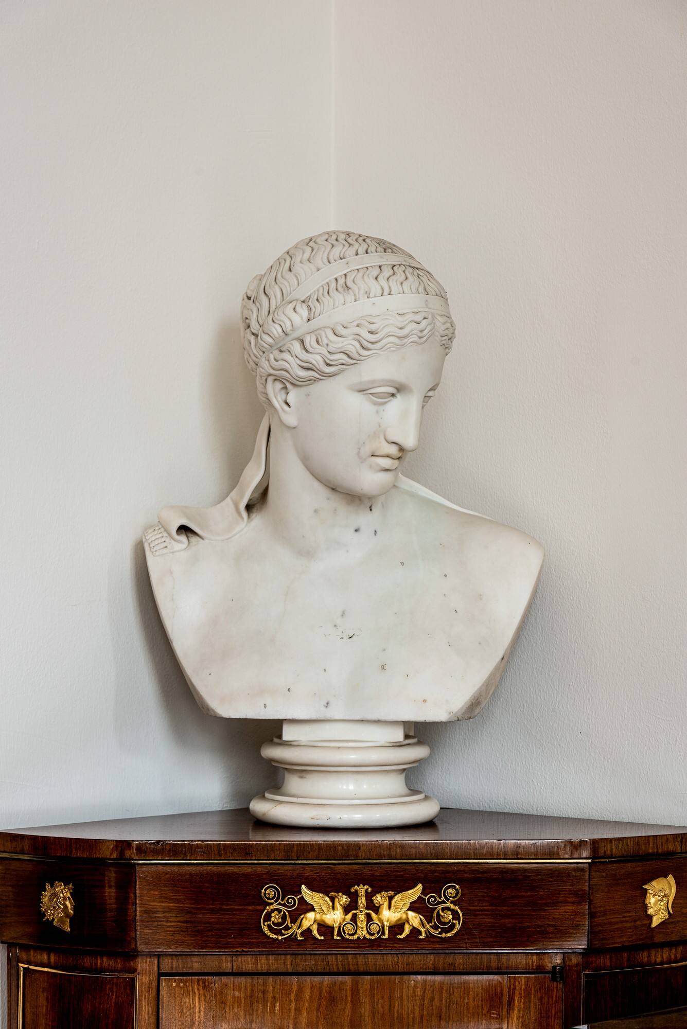 DescriptionDer Kopf ist nach links in Richtung der unbekleideten Schulter gewandt. Im welligen Haar sind zwei Bänderm deren Enden über Rücken und Schultern fließen. Die Büste steht auf einem Sockel mit attischem Säulenbasisprofil. Die Büste ist eine Replik des Kopfes der Statue "Venus von Arles", die sich im Louvre befindet. Seit 1931 befindet sie sich in der Neuen Aula.Leihgabe vom Krongut Ludwigsburg.