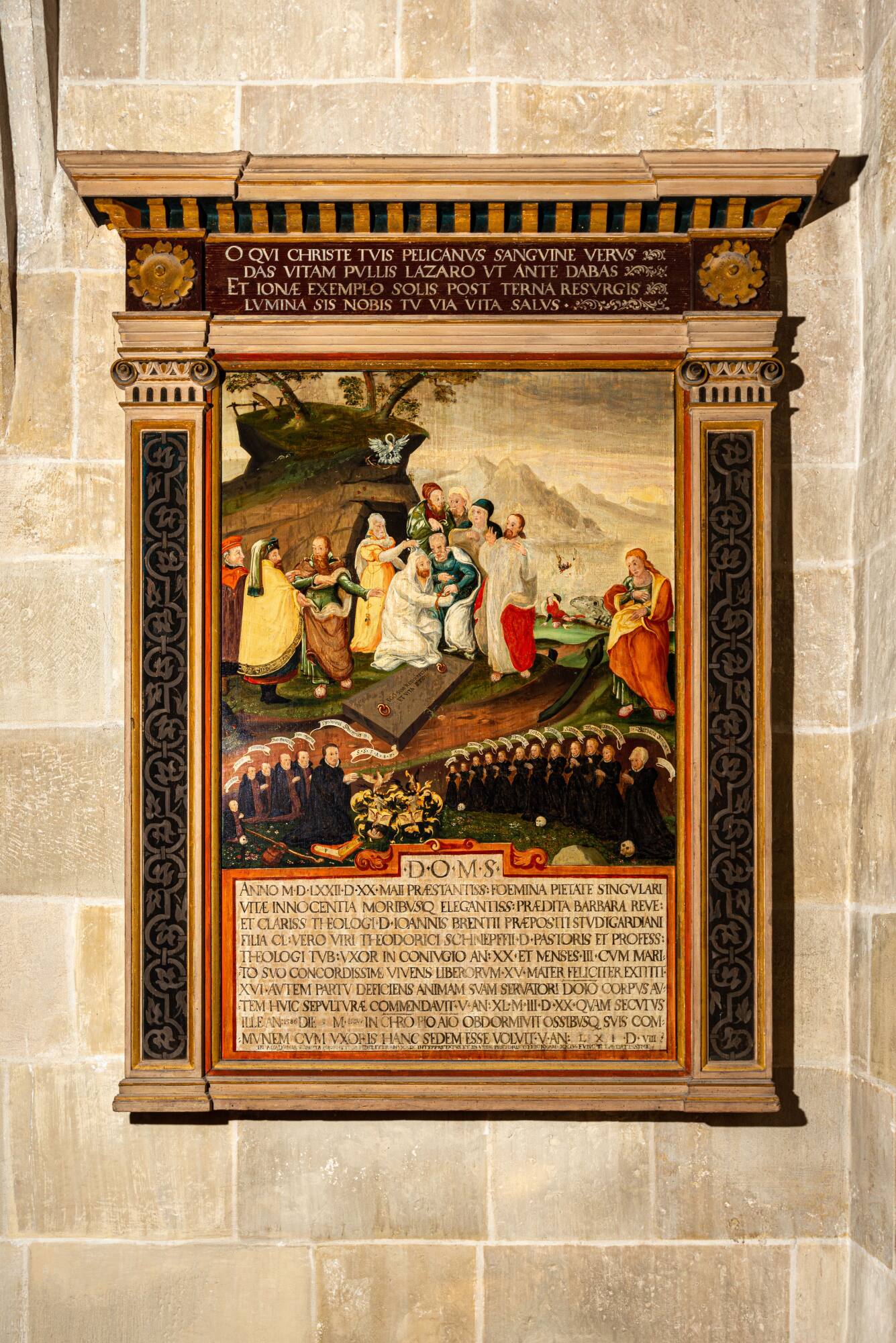 DescriptionDas Grabmonument des Theologieprofessors Dietrich Schnepff (1525–1586) findet man im nördlichen Seitenschiff, 3. Kapelle, Westwand. Anlässlich des Todes seiner ersten Frau Barbara, geborene Brenz, ließ er in der Stiftskirche ein hölzernes Gedächtnismal errichten; sein Todesdatum wurde später nachgetragen. Das Gedächtnismal präsentiert dem Betrachter auf einer Bildtafel zwei biblische Szenen, die Wunder von Lazarus und Jonas. Sie gelten als Präfigurationen der Auferstehung Christi. Im Johannesevangelium findet sich in der Geschichte des Lazaruswunders das Bild des Todes als Schlaf, eine Vorstellung, die im protestantischen Glauben aufgenommen wurde. Beide Szenen stehen damit für die Überwindung des Todes in der Nachfolge Christi. Vor dem Hintergrund des dunkel aufragenden Hügels über Lazarus’ Grab, wo gekreuzte Balken an die Kreuze auf Golgatha erinnern und dessen düstere Beleuchtung einen Eindruck von Hoffnungslosigkeit vermittelt, findet sich mit dem Pelikan ein weiterer Hinweis auf die Erlösung des Menschen. So wie der Pelikan seine Jungen mit seinem Blut nährt, hat Christus sich mit seinem Blut geopfert, worauf auch die Inschrift des Frieses über der Bildtafel hinweist. Die am unteren Bildrand namentlich bezeichnete Familie Schnepff und mit ihr der Betrachter sind damit Zeugen der tröstlichen Nachricht von der Überwindung des Todes. Die im Fries über dem Bild formulierte Bitte um ewiges Heil mag auch für den Betrachter gelten. Im Schriftzug auf der Grabplatte, welche von Lazarus zur Familie Schnepff verweist, findet er die Essenz der tröstlichen Bildbotschaften: „Ich bin die Auferstehung und das Leben“ (Joh 11,25).Standort: Stiftskirche Tübingen, linkes Seitenschiff, 3. Nische, Westwand.