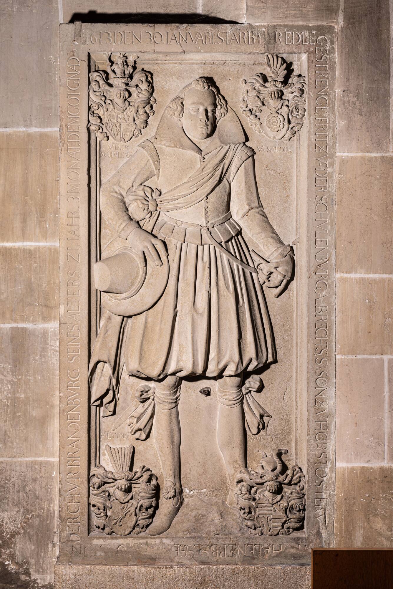 DescriptionDie Steinplatte zeigt den jungen Adligen, der 1591 geborene Fritz von der Schulenburg hatte sich 1612 zum Studium in Tübingen immatrikuliert, verstarb jedoch am Abend des 30. Januar 1613 im Alter von 21 Jahren an den Blattern. Als Adliger erhielt Fritz von der Schulenburg eine Grabstätte im Inneren der Stiftskirche, das repräsentative Grabmal ist rechts des Eingangs zur Chorkapelle an der Wand aufgerichtet. Es zeigt den jungen Mann in zeitgenössischer, eleganter Kleidung mit Brustschärpe, Hut und Degen, umgeben von vier Wappen. Die umlaufende Schrift des Grabmals entsprach einer älteren Tradition und nicht den Konventionen jener Zeit. Folglich wird der Blick auf die Herkunft des Verstorbenen gelenkt, auf seine Abstammung aus altem Adel. Auch die Gnadenbitte des Grabmals „DEM GOT GNAD“ entspricht älteren Formen und war von anderen abgelöst worden.Standort: Stiftskirche Tübingen, rechtes Seitenschiff, vor linker Chorkapelle rechts an Ostwand.