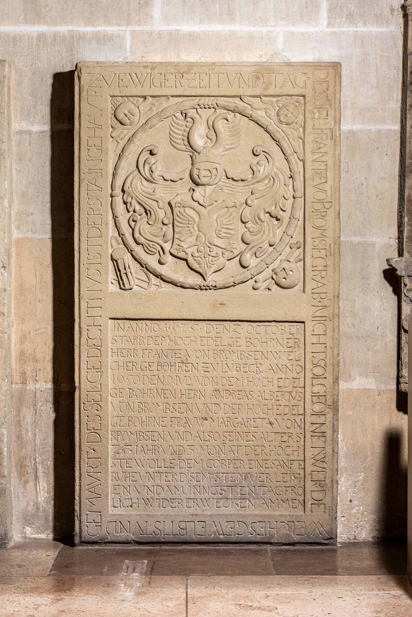 DescriptionUnter der Orgelempore ist das Grabmal des, im Alter von 25 Jahren, verstorbenen Franz von Brombsen (1650–1675) aufgerichtet. Die eher schlicht gestaltete zweizonige Grabplatte zeigt oben das Wappen in einem Kreis – in der Tradition mittelalterlicher Totenschilde – des aus Lübeck stammenden Studenten. Der untere Teil enthält die Grabinschrift mit Auferstehungsbitte. Auch die Umschrift lässt an mittelalterliche Grabsteine denken. Mit diesen zeitlichen Rückverweisen versuchte man die eigene Abstammung zu nobilitieren. Das Familienwappen wird von Engelsköpfen und Vergänglichkeitssymbolen umgeben, wie Totenschädel, Sanduhr, Sense, Schaufel und Hacke.Franz von Brombsen hatte sich am 17. Juni 1673 in Tübingen immatrikuliert und starb am 2. Oktober 1675. Er erhielt ein gemauertes Grab in oder bei der Kirche, das, wie die Umschrift erklärt, nicht für eine weitere Bestattung geöffnet werden durfte.