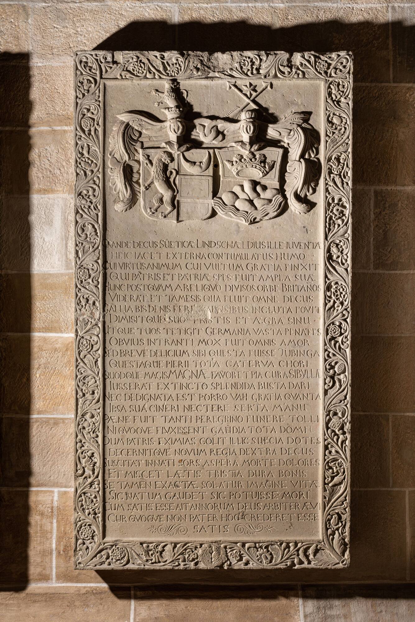 DescriptionDer aus schwedischem Adel stammende Isaak von Lindschöld (1670–1686) hatte sich als sechzehnjähriger Student am 10. Mai 1686 in Tübingen immatrikuliert, verstarb jedoch noch im selben Jahr. Er erhielt neben dem Gedächtnismal (ELK-Sg-89) auch eine Grabstätte in oder bei der Kirche. Das Grabmal befindet sich heute nur wenige Schritte vom Gedächtnismal entfernt, an der Westwand der Vorhalle. Die klar gegliederte, ringsum mit einem Band aus fein gearbeiteten Blütenranken geschmückte Platte zeigt mit den Familienwappen die edle Herkunft des Studenten an. Das Gedächtnismal zeigt oben das von einem Lorbeerkranz umrahmte Abbild des Verstorbenen, von Engeln aus dem Bereich des Irdischen in die himmlische Sphäre getragen. Die Trauer über dessen viel zu frühen Tod kommt in den Inschriften der beiden Grabmonumente bewegend zum Ausdruck. Nicht nur trauerten der „Musenchor“ um ihn, sondern auch die Universität; die „große Sibylle“, hatte eine „prächtige Grabstätte“ und „geflochtene Kränze“ für den Studenten befohlen. In beiden Inschriften klingt die persönliche Trauer des Vaters Erich von Lindschöld an. Anrührend erscheint, wie der Vater die Verdienste, die der Sohn nicht hatte erlangen können, durch die Erwähnung der eigenen väterlichen Taten auszugleichen versuchte, wohl um anzuzeigen, was der Sohn noch alles hätte leisten können.Standort: Stiftskirche Tübingen, Vorhalle, links vom Eingang, Westwand.