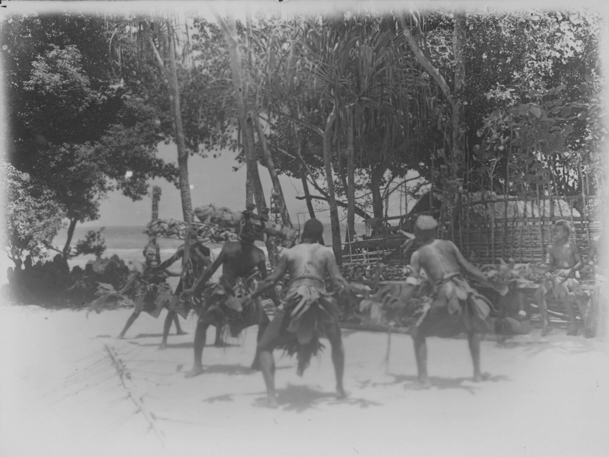 DescriptionTanzszene mit Malanggan-Masken "Nashornvögel" und "Schlangen" am Strand in Vásokup bei Hámba in Neuirland. Zu sehen sind diese Masken auch auf der Abbildung des Malanggan-Hofes auf AOI-Es-Neg59.Fotografische Dokumentation während der "Deutschen Marine-Expedition 1907-1909", vermutlich von Richard Schilling.