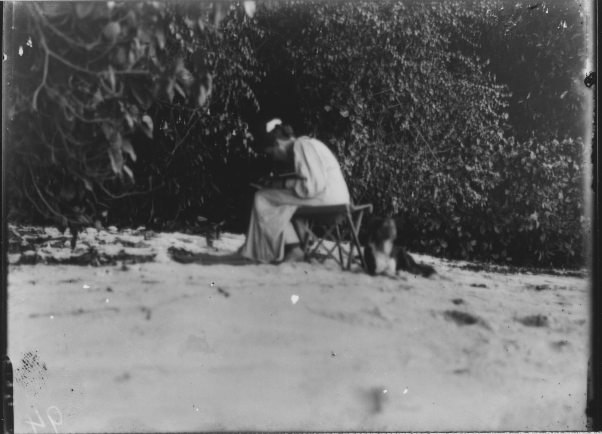 DescriptionElisabeth Krämer-Bannow (1874-1945) bei künstlerisch-dokumentarischer Arbeit in Lámasong. Fotografische Dokumentation während der "Deutschen Marine-Expedition 1907-1909", vermutlich von Richard Schilling oder von Augustin Krämer.
