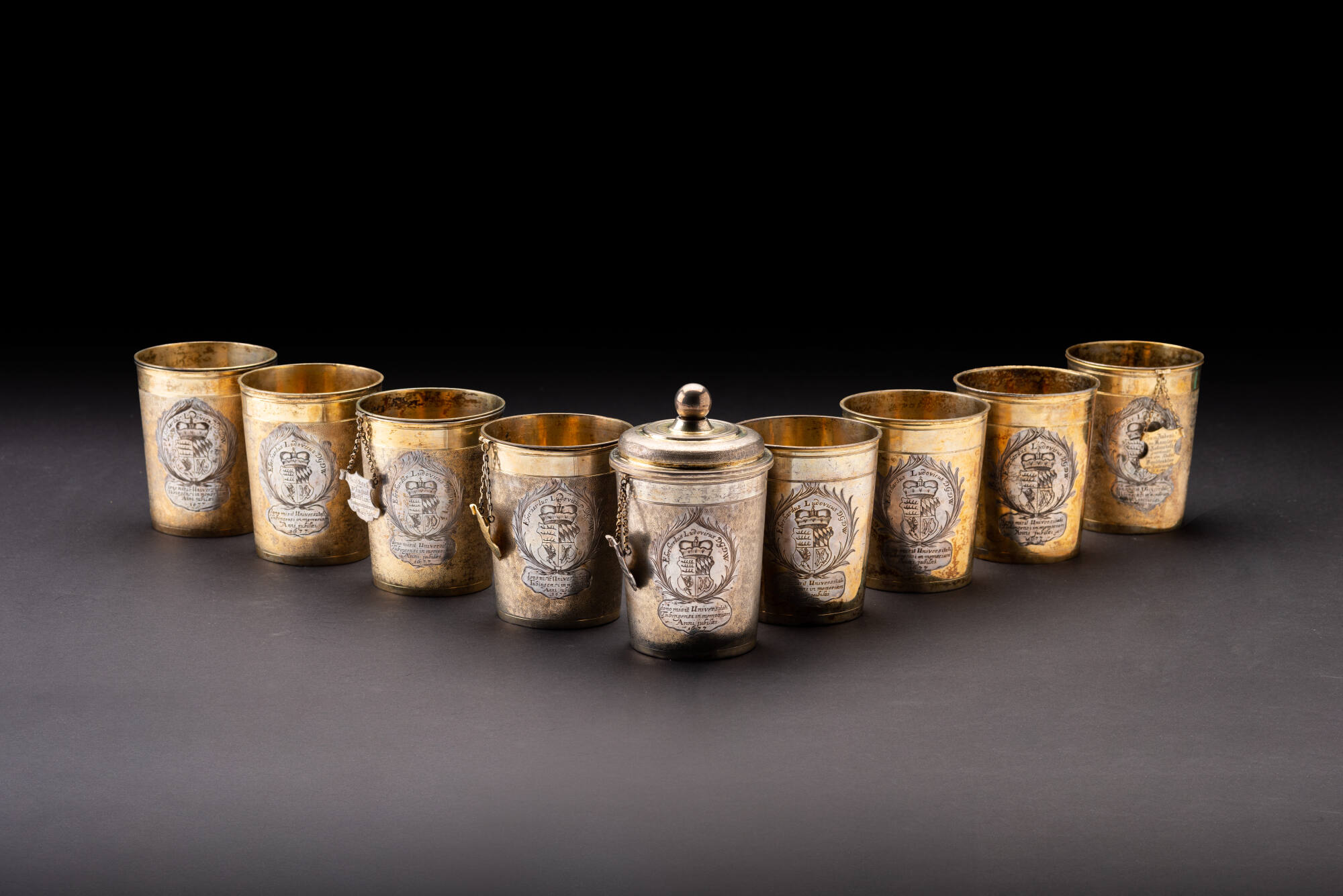DescriptionAlle Becher weisen das württembergische Wappen, Datierung und die gleiche Aufschrift: "Eberhardus Ludovicus D.G.D.W. dono misit Universitati Tubinensi in memoriam Anni jubilari 1677." Im Boden des Bechers befindet sich der Herkuftsstempel: Der Augsburger Pinienzapfen, das Beschauzeichen dieser Stadt, und dazu das Zeichen des Goldschmieds Christian Schließer: zwei gekreuzte Schlüssel. Von den ursprünglichen Deckeln ist nur einer erhalten. Auf den angehängten Wappenschildern sind die Stifternamen eingraviert.a) Geschenk von Oskar Gärttner Regierungsrat 6. März 1889