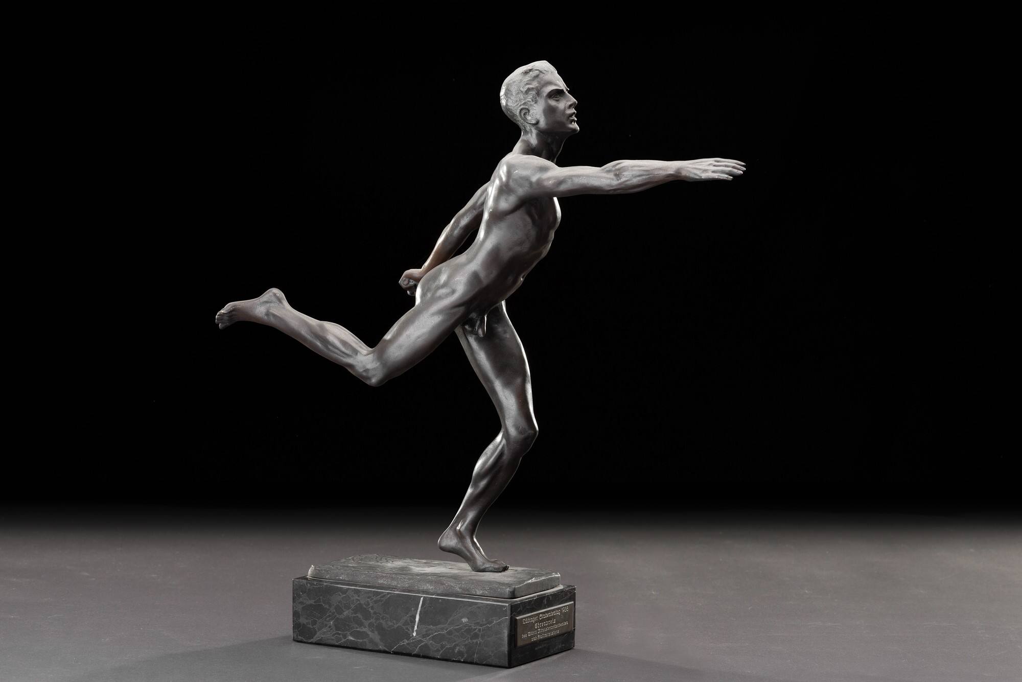 DescriptionMännliche Statue beim Laufen mit ausgestreckter rechter Hand, auf dem linken Bein abrollend. Auf der vorderen Schmalseite des Sockels befindet sich folgende Inschrift: "Tübinger Studententag 1938 Ehrenpreis des Württ. Ministerpräsidenten und Kultministers"DimensionsHöhe: 40 cm