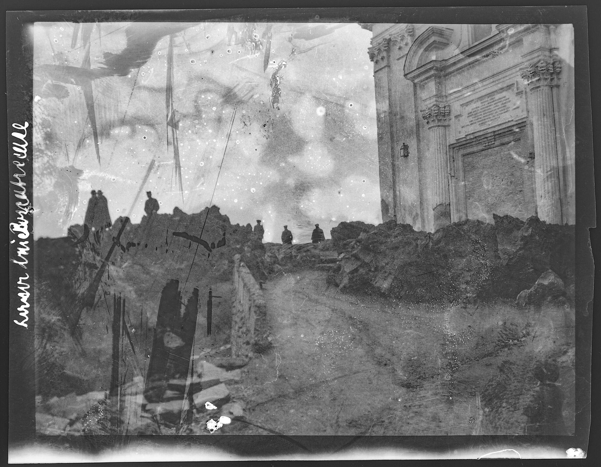 Diese und eine weitere Aufnahme von erkalteter Lava im Wohngebiet von Boscotrecase erlaubt die Datierung der Reise auf die Jahre bald nach dem Vesuvausbruch vom April 1906. Das Portal der Kirche ist auf dieser Aufnahme bereits zugemauert, erste Aufräumarbeiten haben begonnen.