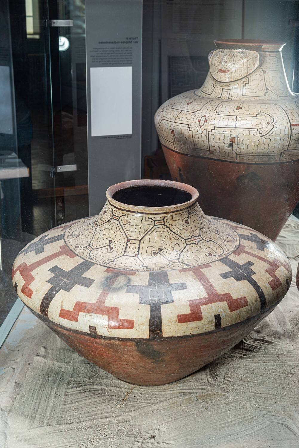 DescriptionDiese Keramik wurde bei den Shipibo-Conibo im Tiefland von Peru hergestellt. Der Masáto-Gäkrug "ani chómo" war in Gebrauch und wurde bei drei Festen verwendet. Er diente der Aufbewahrung des Masáto-Bieres.MediumTonerde, polychrom bemalt, gefirnisst