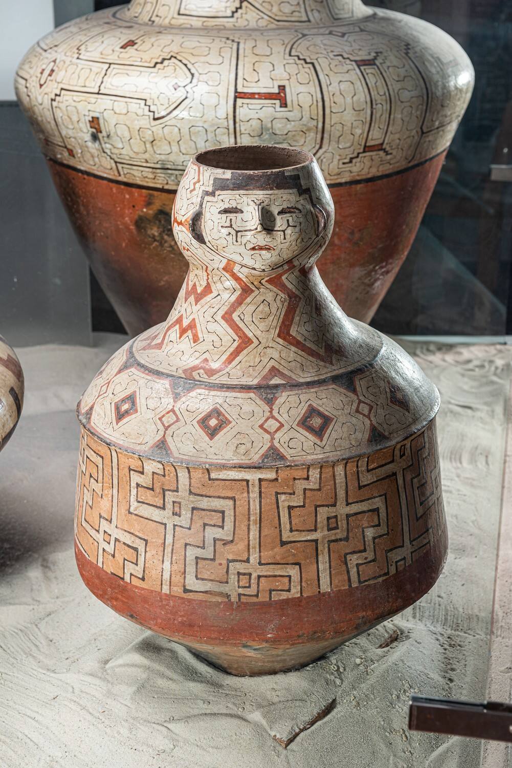 DescriptionDiese Keramik wird als "ani chómo" bzw. auch als "joni chómo" bezeichnet und wurde bei den Shipibo-Conibo im Tiefland von Peru hergestellt. Der Firniss der Innenseite lässt auf die Verwendung als Wasserkrug schließen. Hier ist eine poröse Innenwand erwünscht, da sie zur Kühlung des Wassers beiträgt. Am Gefäßhals befinden sich zwei modellierte Köpfe.DimensionsGesamthöhe: 68 cm (680 mm)
