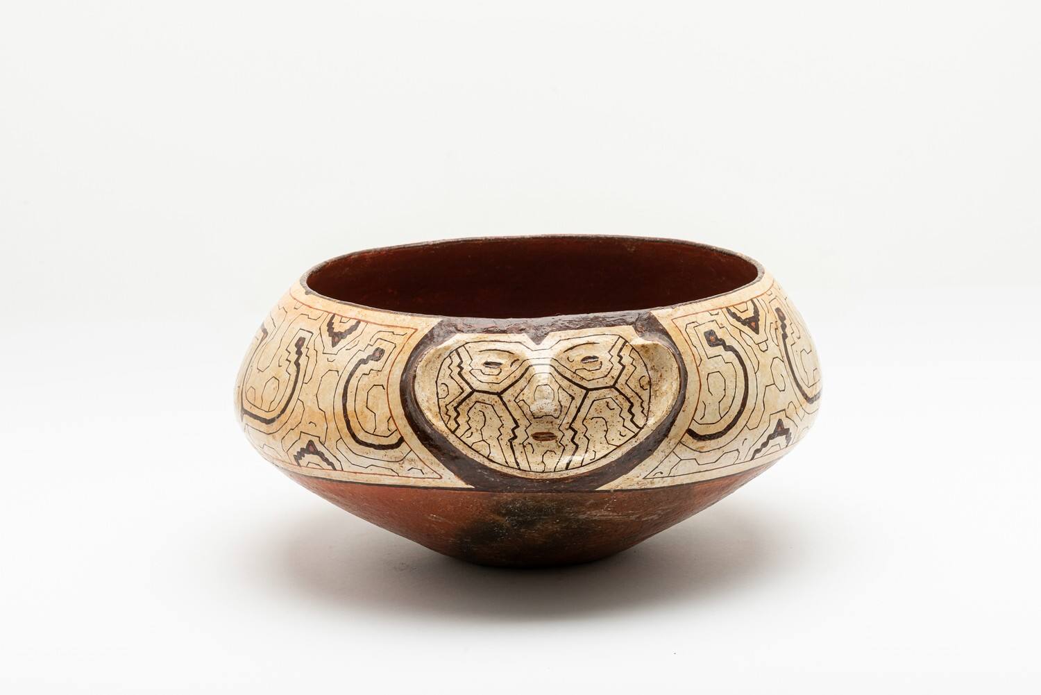 DescriptionDiese Keramik wurde bei den Shipibo-Conibo im Tiefland von Peru hergestellt. Auf der Masato-Trinkschale "ani könpo" finden sich zwei Darstellungen von menschlichen Gesichtern.DimensionsGesamthöhe: 16,5 cm (165 mm)