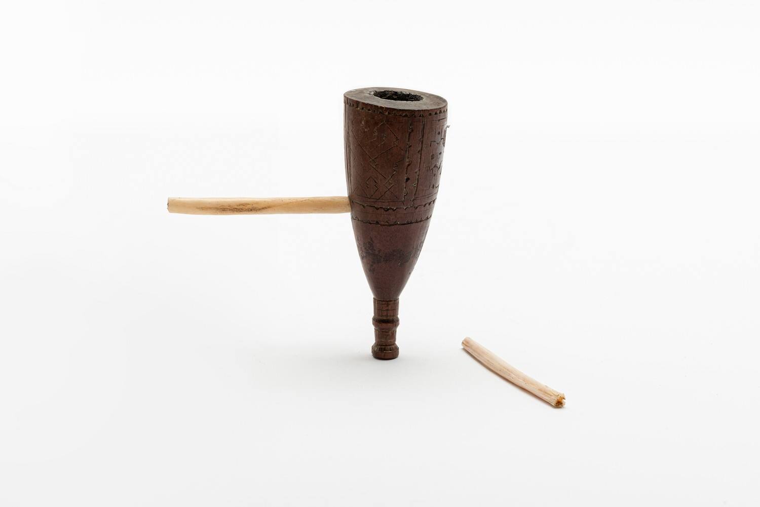 DescriptionObjekte wie ein Pfeifenkopf wurden nach ihrer Fertigstellung vom Schnitzer zu seiner Frau oder einer anderen weiblichen Verwandten getragen, die darauf ein ihr geeignet erscheinendes Ornament zeichnete. Die Linien schnitzte dann der Mann im Kerbschnitt aus.DimensionsDurchmesser (Kopfstück): 3 cm